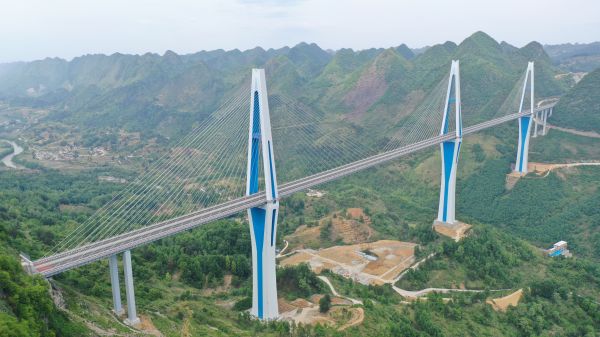 平塘特大桥是贵州省平塘至罗甸高速公路的控制性工程,主桥为三塔双索面钢混组合梁斜拉桥,桥梁全长2135米。该大桥为山区最大跨径的三塔斜拉桥,中塔塔高332米,创造了“最高混凝土桥塔”的世界纪录。从空中鸟瞰,三座“钻石型”的超高主塔依次排开,矗立在云雾升腾的漕渡河谷,宛如一座壮美的“天空之桥”。