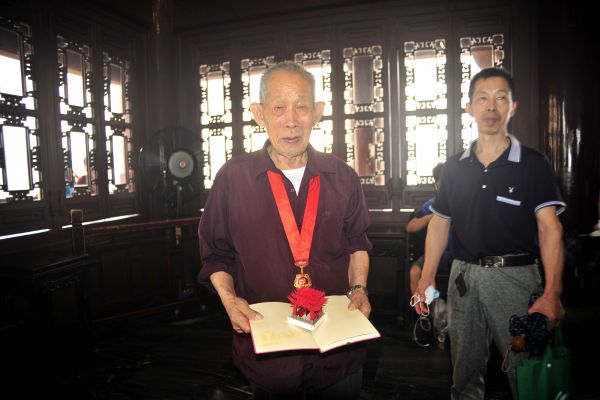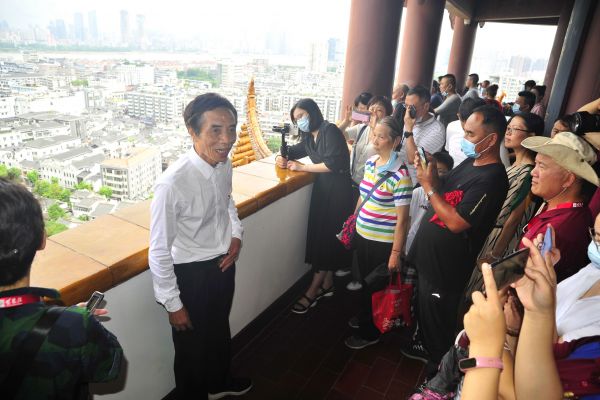 现场还有一位戴着“光荣在党50年”勋章的游客引人瞩目,他叫张裕志,来自河北邯郸。今年87岁的他有着66年党龄,这次送孙子去南昌读书,一家人路过武汉,他知道毛主席曾多次登蛇山,特意戴上自己刚刚获得的勋章来游黄鹤楼。