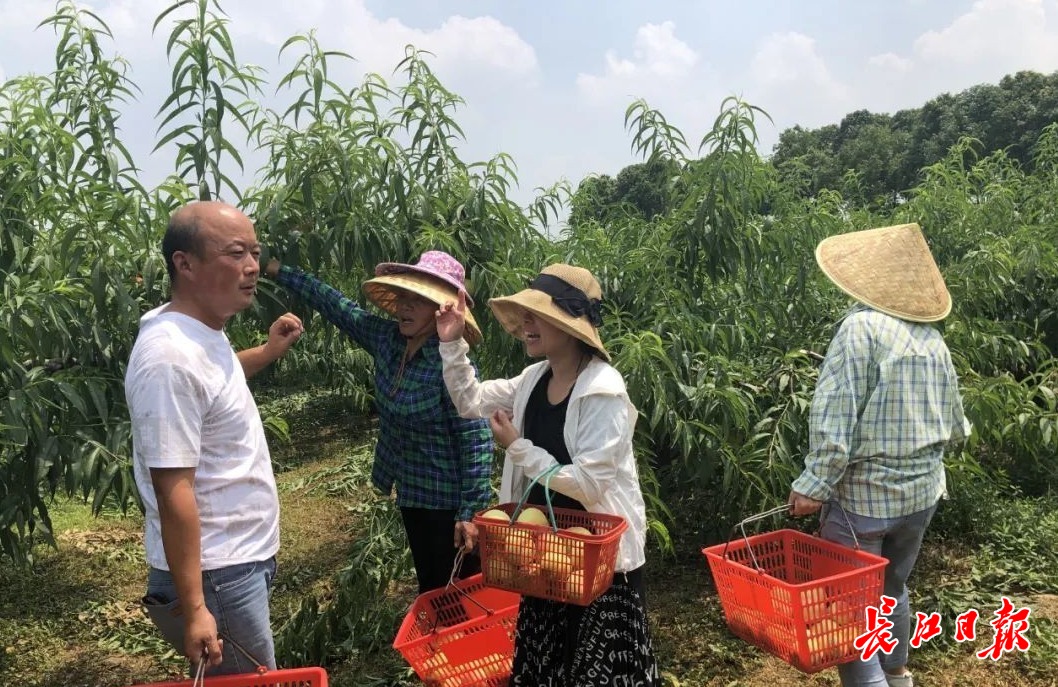 眼下正是水蜜桃丰收季节,商春霞(右二)和村民,在雨露水蜜桃园采摘。长江日报记者胡义华 摄