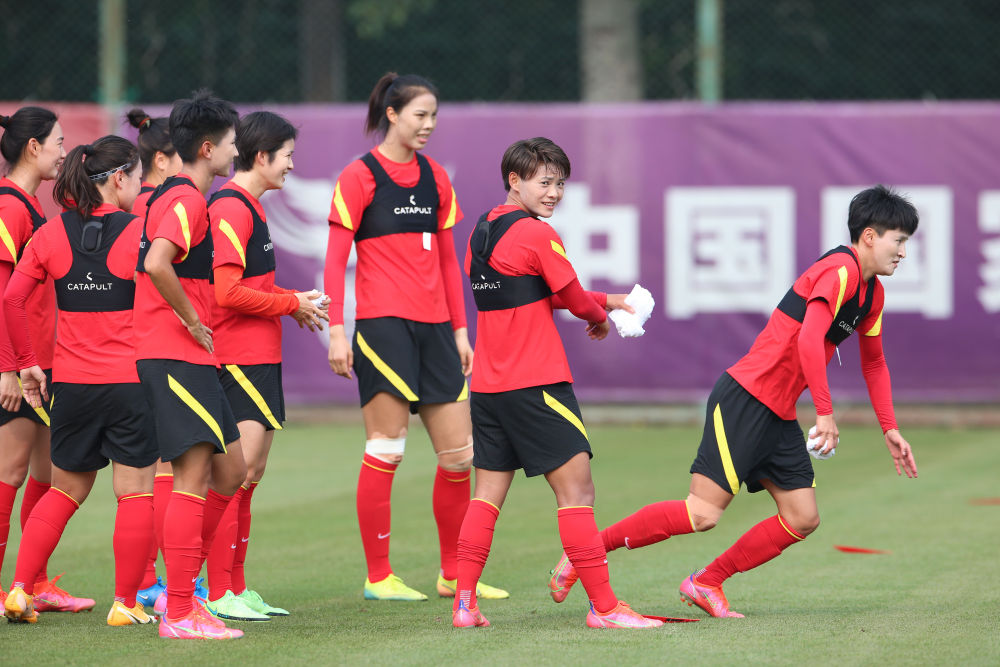 7月10日,中国女足队员在公开课上热身。新华社记者 丁旭 摄
