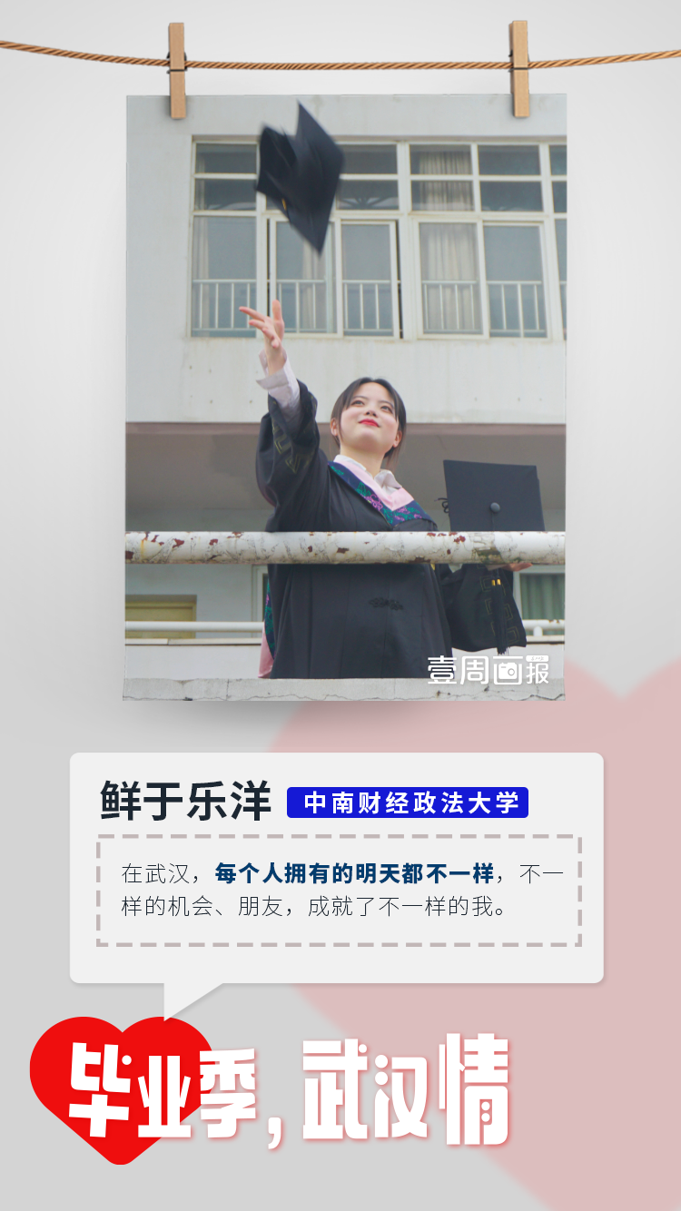 华中农业大学毕业生叶雅阁:武汉,在我心里占据极其重要的位置,我人生中重要的三年在这里度过,是她护我成长,育我成才,助我圆梦,往后的时光,我将继续在这片土地上奋斗。选择一座城市,奋斗一段青春,遇见一位佳人,收获完美人生。爱你,我的大武汉!