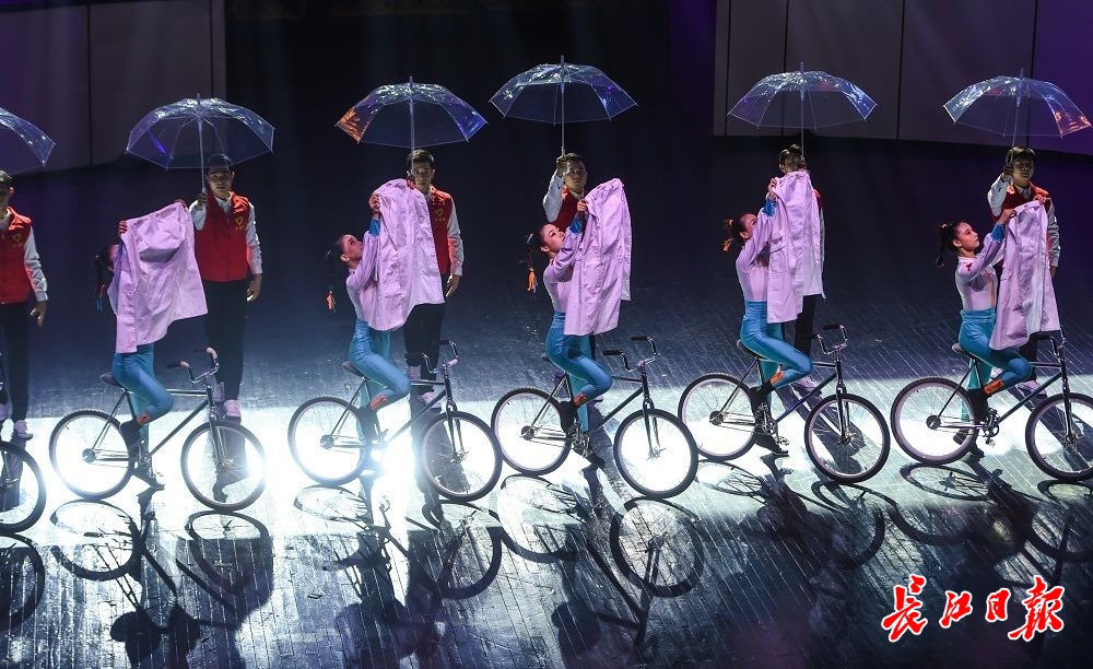 “台上一分钟,台下十年功”用来形容杂技演员再恰当不过。在舞台上扮演着医务人员、建筑工人、外卖小哥、货运司机、社区工作者、志愿者、下沉党员等不同角色的都是武汉杂技团的演员。记者了解到,每个杂技演员至少上台五次,一人要饰演多个角色。