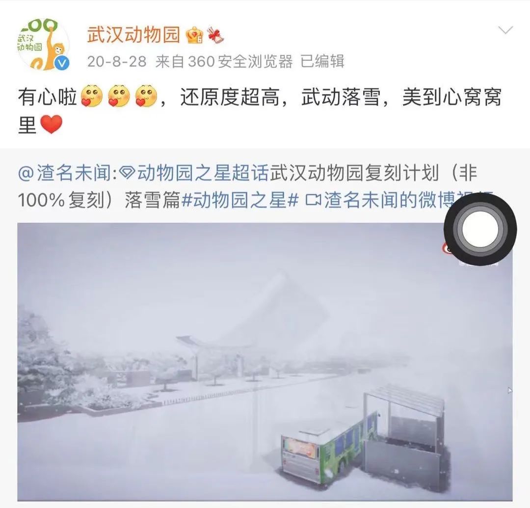 2020年8月,王德翔曾公开发布过复刻武汉动物园被漫天白雪覆盖的短视频,这一视频得到武汉动物园的关注和点赞。
