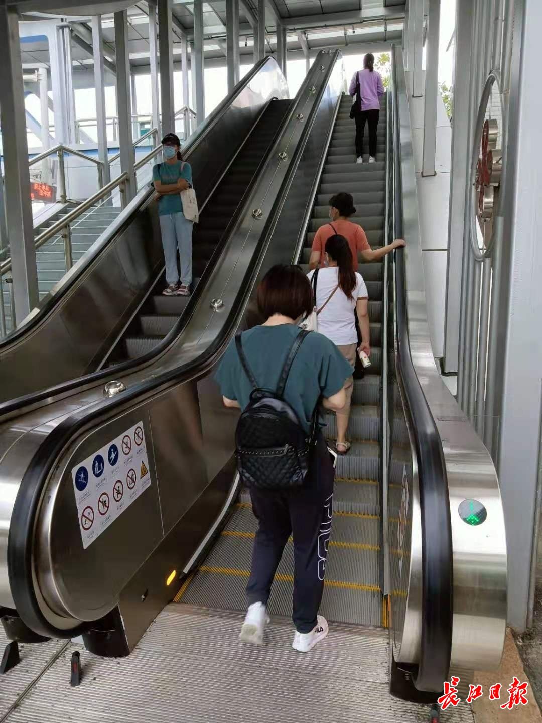 同济健康天桥电梯开通运行,市民乘手扶电梯过街。长江日报记者李爱华 摄