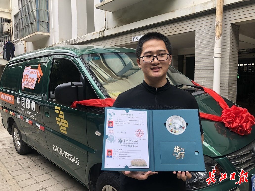 上午11时14分,武汉市洪山区邮政分公司投递员廖思东,驾驶扎有红花、挂有“录取通知书投递专车”的邮政车辆,来到珞喻路喻园小区一栋居民楼下,拨打考生本人手机号。