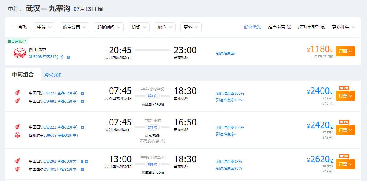 武汉天河机场工作人员介绍,为进一步完善武汉机场航线网络,在民航监管局给予航班时刻支持下,天河机场加强与九寨黄龙机场、四川航空的合作,在暑期开通武汉至九寨沟航线。记者通过网上第三方售票平台查询到,以7月13日的航班为例,首航售价1180元起,比转机价格便宜不少。