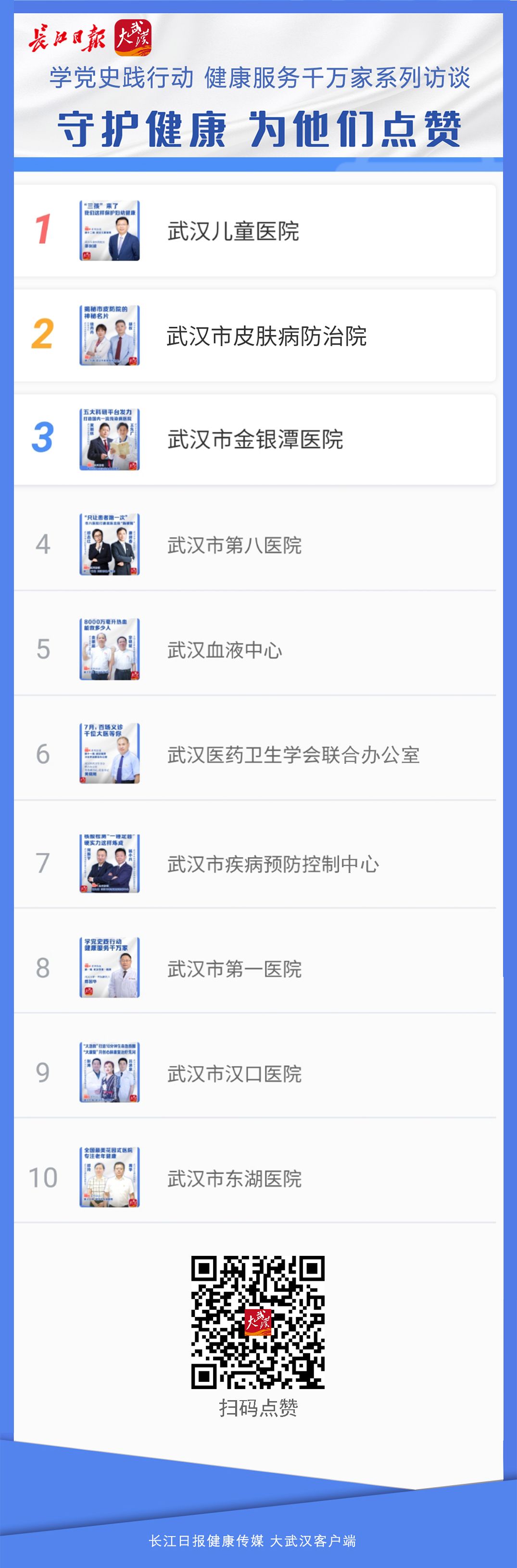 人气最高的武汉儿童医院访谈中,院长邵剑波介绍了“三新”武汉儿童医院与武汉儿童“心心相印”,还有给儿童做手术更精细的达芬奇机器人。人气位居第二的皮肤病防治院访谈,院长胡权介绍了以医养结合的方式建麻风区域防治中心。人气位居第三的武汉市金银潭医院访谈,院长黄朝林通过访谈喊话市民,未来他们将加强支撑学科、综合学科建设,一站式解决患者健康问题。此点赞活动将持续至7月19日16:00,欢迎市民们继续参与,为自己喜爱的健康访谈点赞。