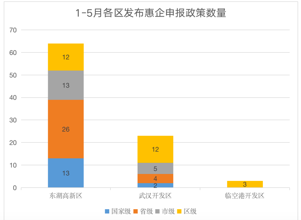 对比东湖高新区和武汉经开区共同转发国家、省、市级5项政策来看,武汉经开区申报材料最省时省力,临空港经开区在此项指标上因缺失数据同样不做统计。