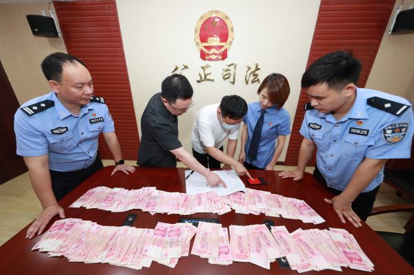 2021年7月16日上午,武汉铁路公安处民警会同武汉铁路运输法院法官、武汉铁路运输检察院检察官,向受害人岳刚发还19万元。 通讯员胡金力 摄