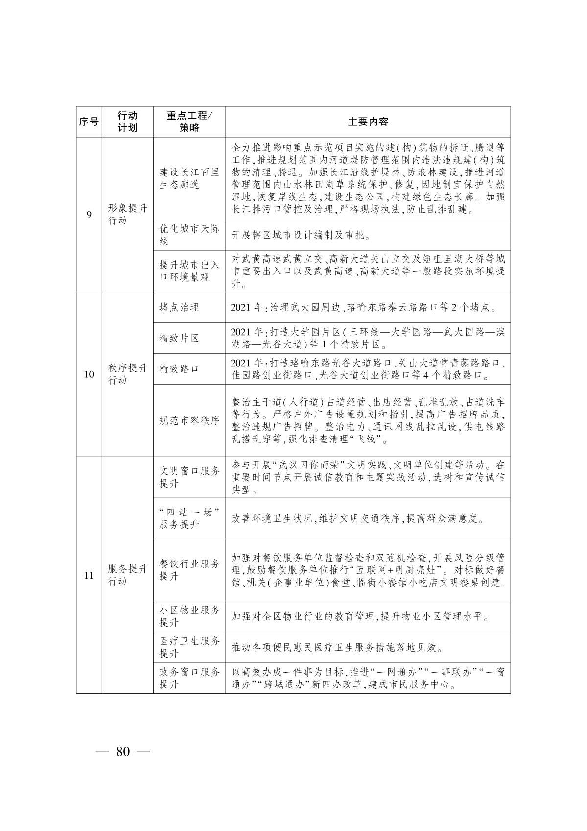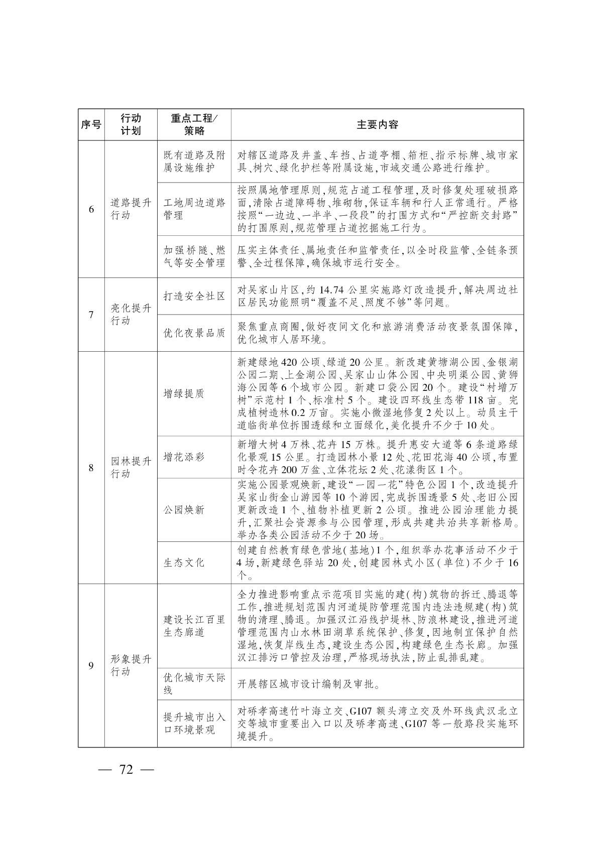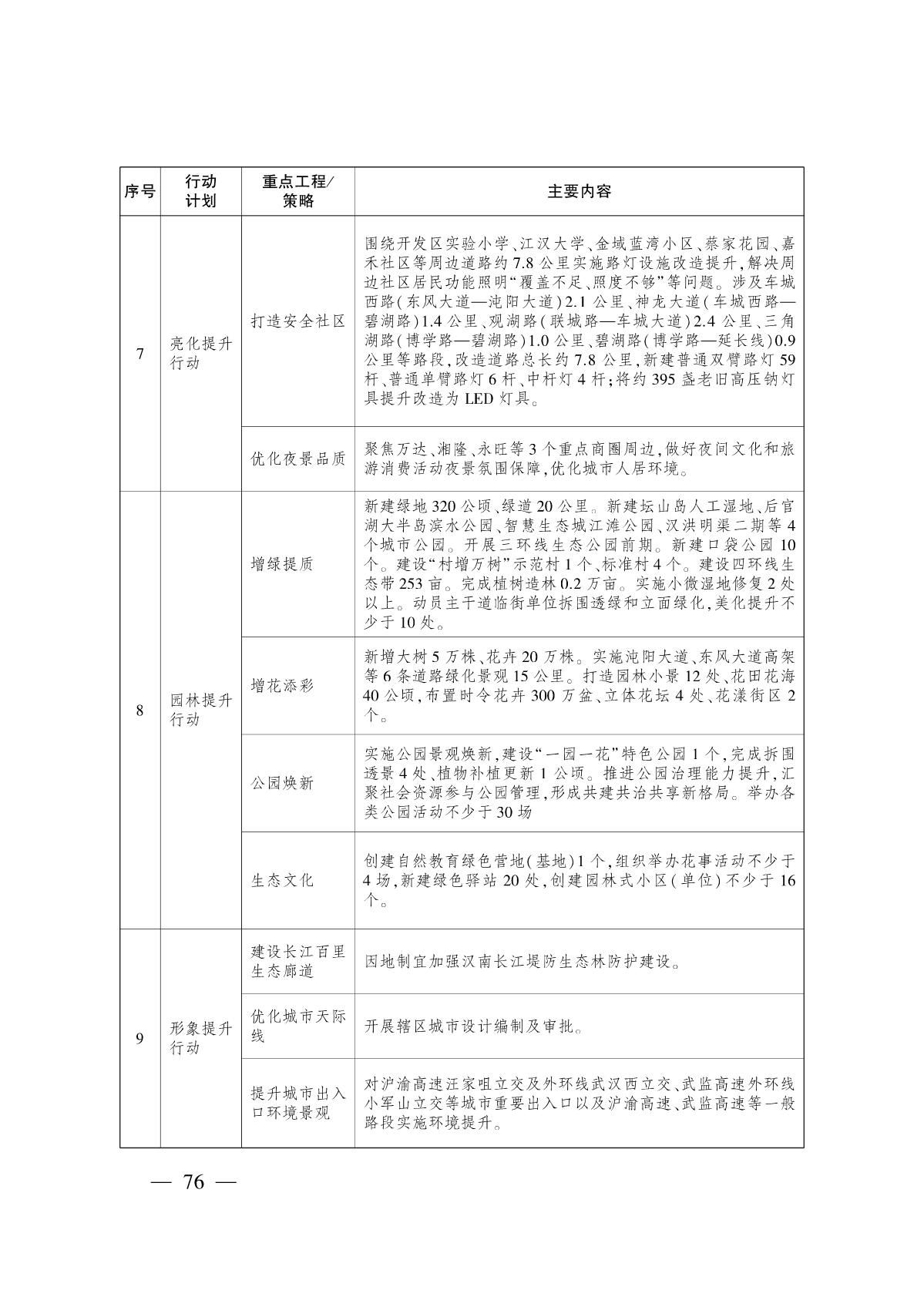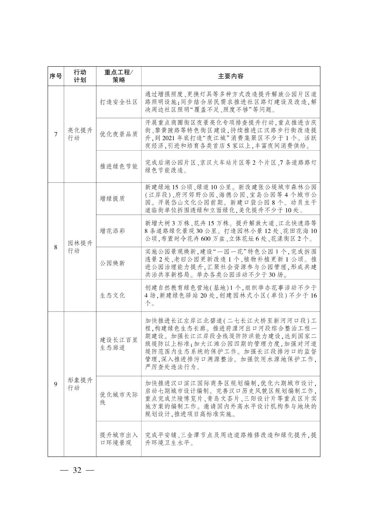 (五)聚焦“美”,实施形象提升行动。围绕建设“安全岸线、生态岸线、生活岸线、景观岸线”的目标,加快实施百里长江生态廊道14个重点示范项目,构建“城、滩、洲”一体化发展的经济活力示范区和世界级历史人文集聚展示区。坚持规划引领,推进重点功能区、历史风貌区建设,着力打造武汉广电全媒体中心、天河国际会展中心等一批标志性建筑,塑造错落有致、疏密有度、高低起伏的城市天际线。对17个城市重要出入口、34个一般路段实施环境提升,展示特色鲜明、环境优越的城市门户形象。
