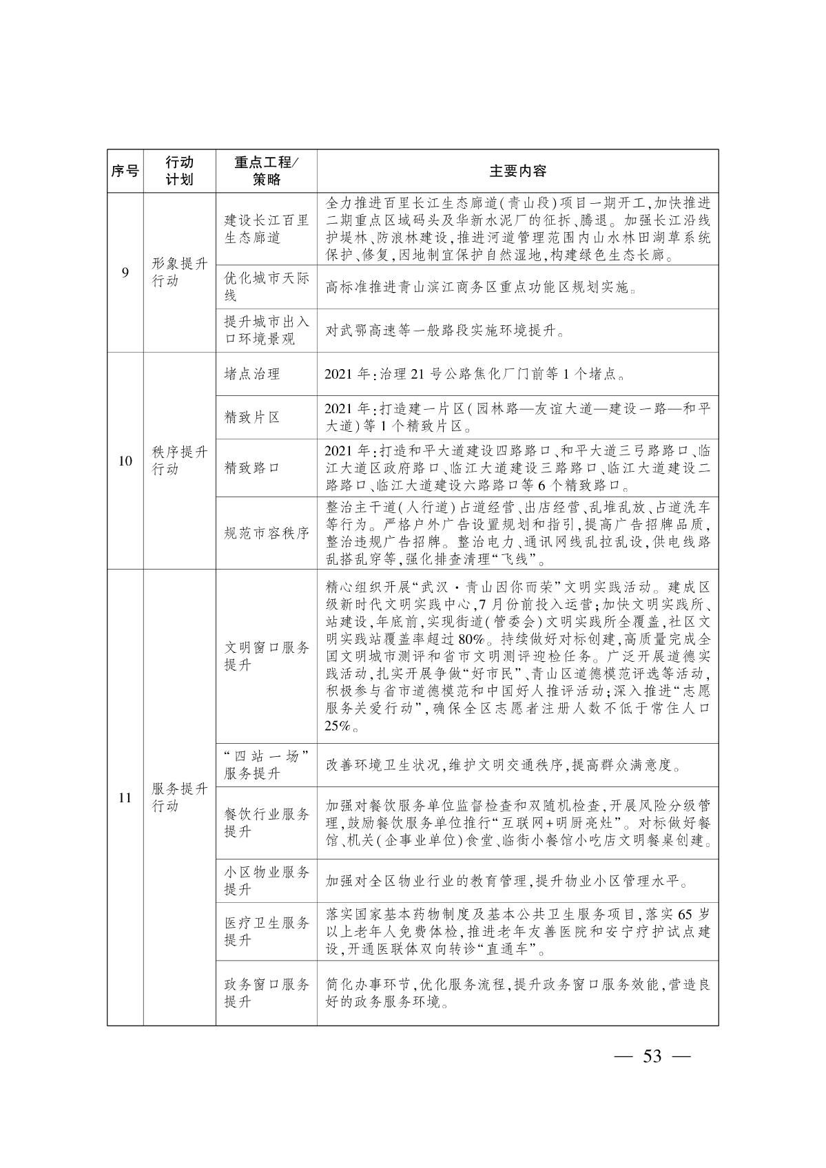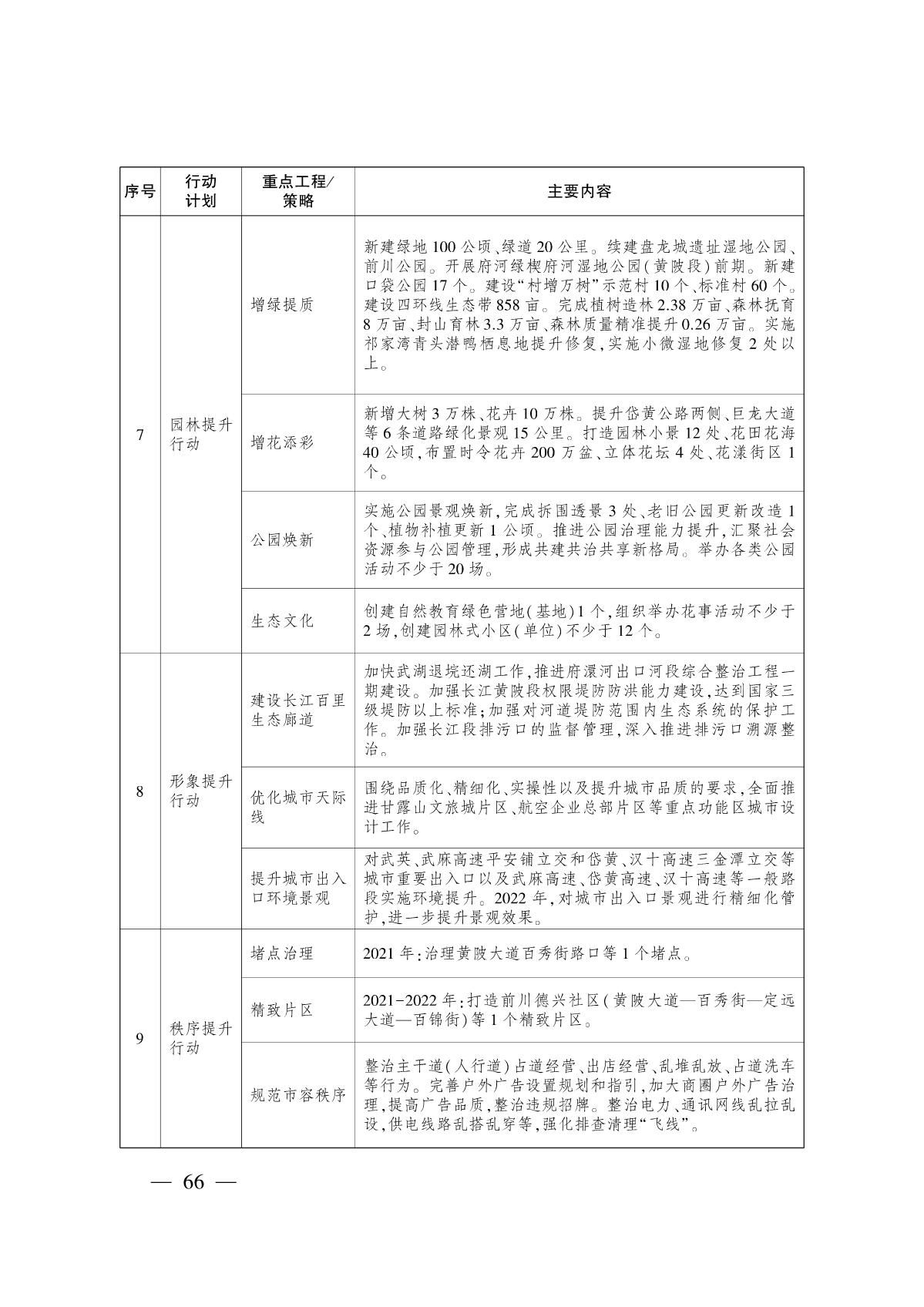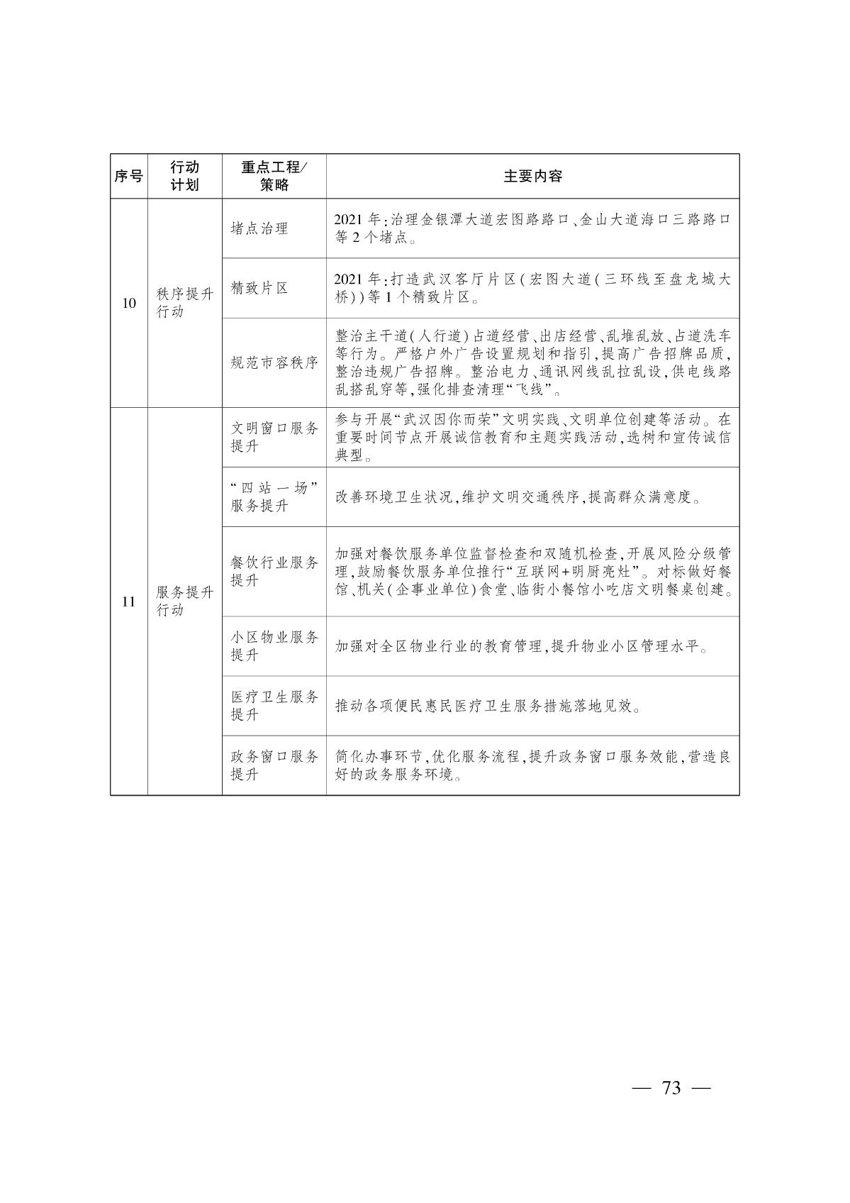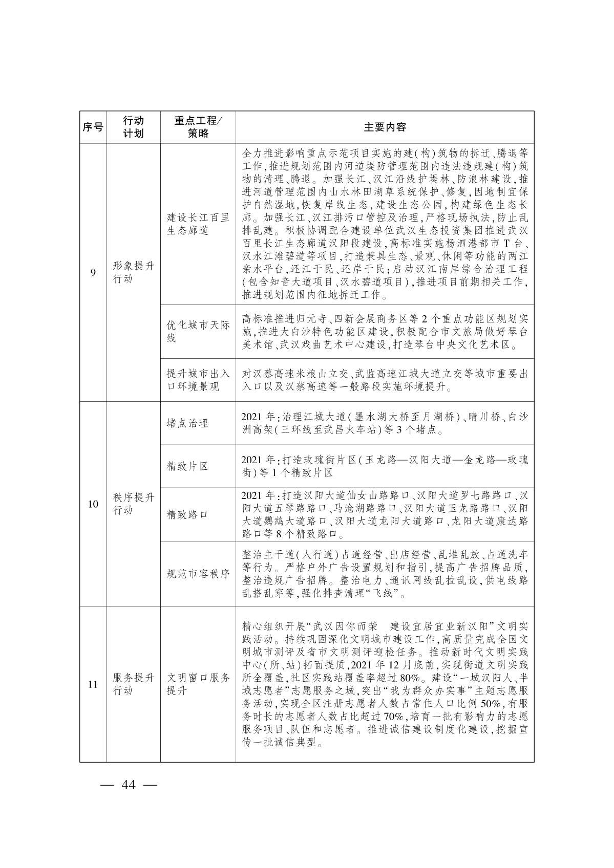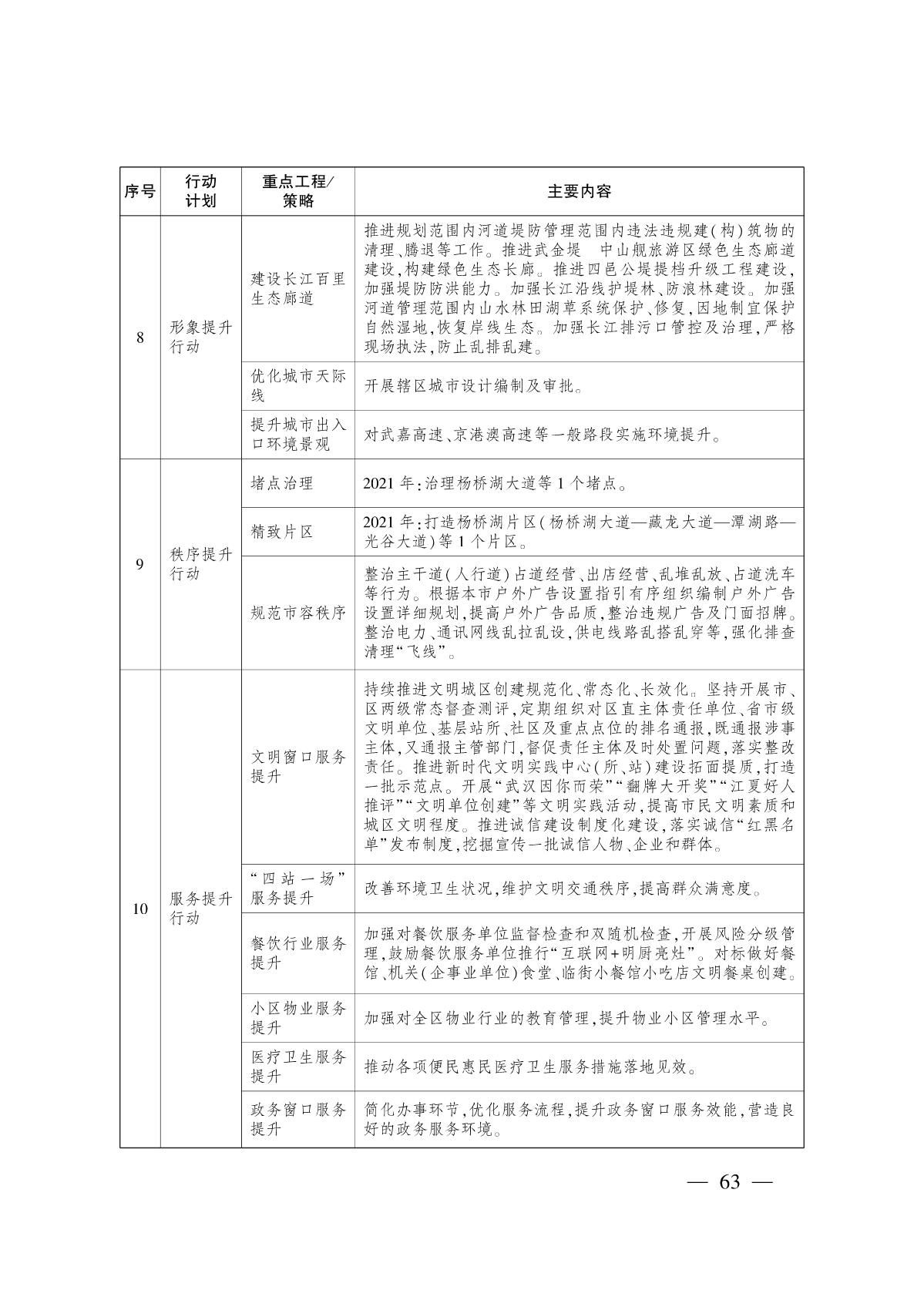 (五)聚焦“美”,实施形象提升行动。围绕建设“安全岸线、生态岸线、生活岸线、景观岸线”的目标,加快实施百里长江生态廊道14个重点示范项目,构建“城、滩、洲”一体化发展的经济活力示范区和世界级历史人文集聚展示区。坚持规划引领,推进重点功能区、历史风貌区建设,着力打造武汉广电全媒体中心、天河国际会展中心等一批标志性建筑,塑造错落有致、疏密有度、高低起伏的城市天际线。对17个城市重要出入口、34个一般路段实施环境提升,展示特色鲜明、环境优越的城市门户形象。