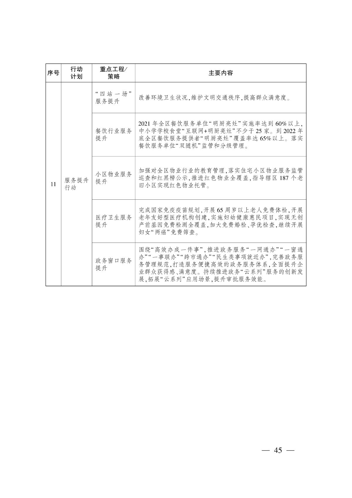 1.打造和谐幸福家园样板区。加快建设完整社区,实施绿色社区创建行动。打造15分钟生活圈,从市民角度切实提升生活品质,完善教育、养老、菜市场等基本公共服务设施,大力发展社区商业,实施便利店品牌化、连锁化、智能化三大提升行动,鼓励采取“一站式”邻里中心模式。到2025年,各中心城区分别选取2个街道,重点建设15分钟生活圈示范工程。打造12分钟文体圈,实施“文化五城”建设工程,构建普惠型、高质量、可持续的公共文体服务体系,加快“四馆三场两中心”建设,到2025年,每个区建成体育场、综合性体育馆、游泳馆等“一场两馆”,力争全民健身中心街镇全覆盖。