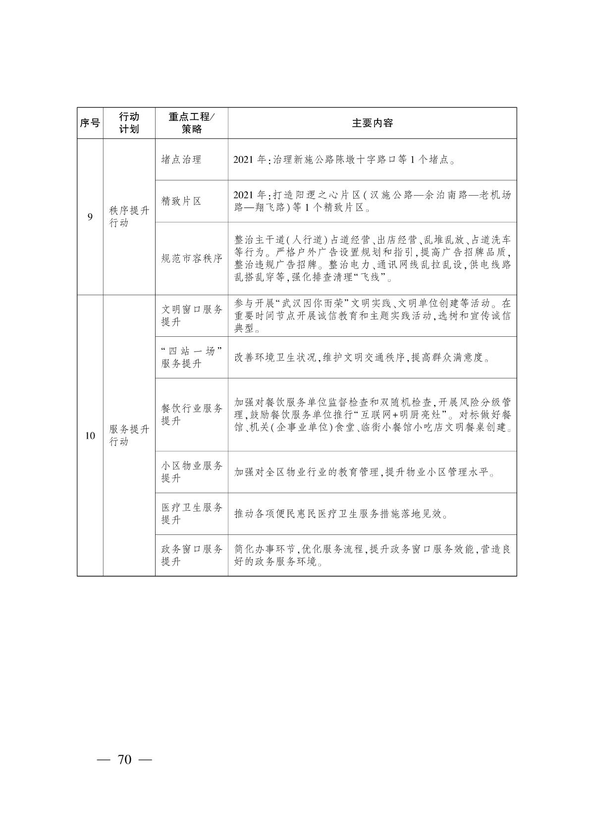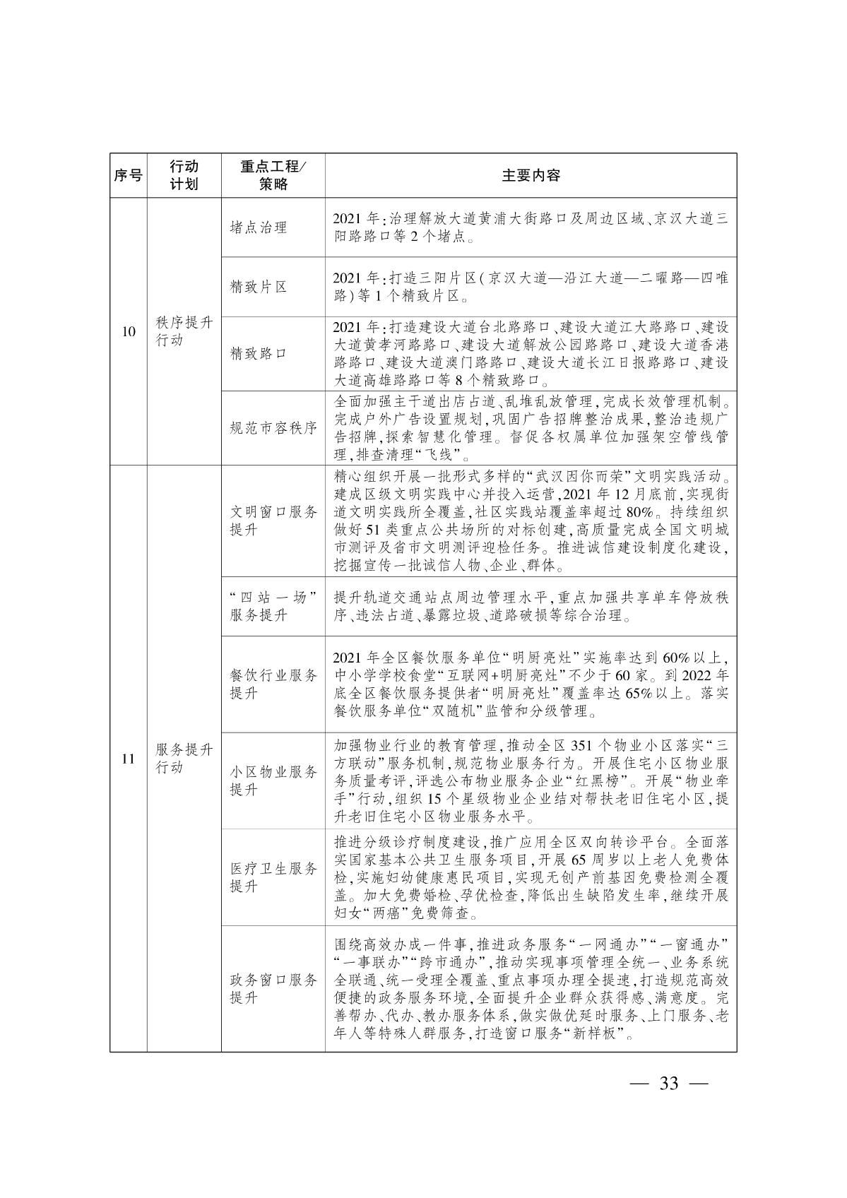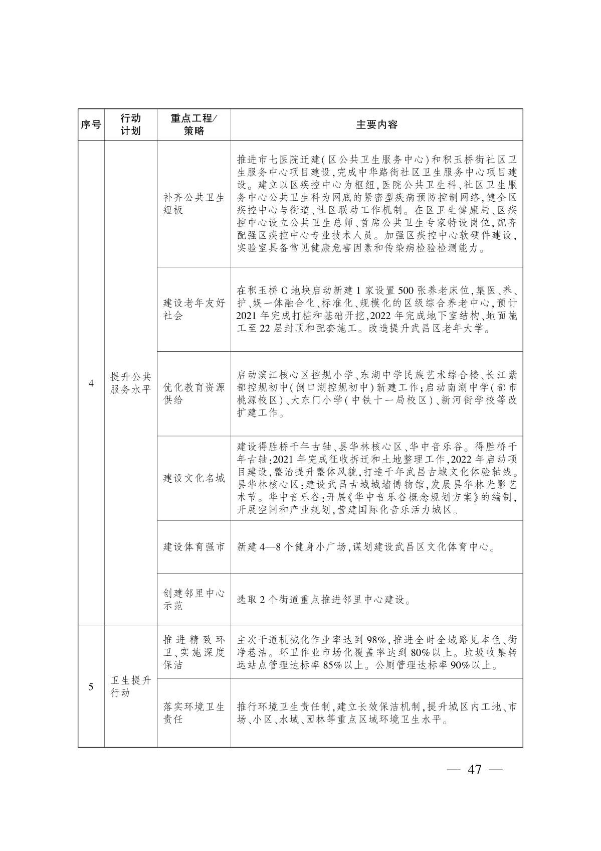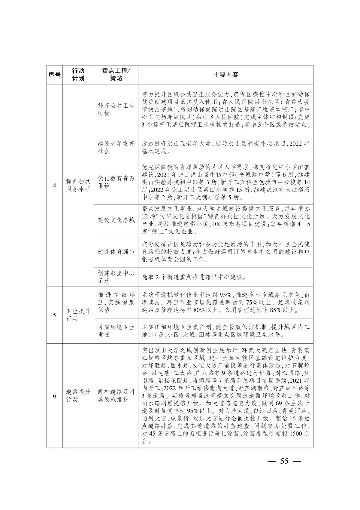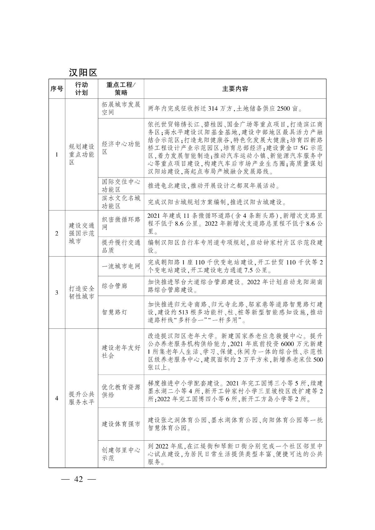 1.实施主城做优。完善城市核心功能,塑造高品质城市“主中心”形象。加强打造“两江四岸”中央活动区,坚持世界眼光,高水平开发建设二七滨江、汉正街、武昌滨江、青山滨江、王家墩、四新等重点功能区,高品质打造武昌湾、汉江湾、南湖白沙等片区,促进现代服务业集聚发展,城市功能品质有效提升。推进古城新生,打造江岸历史之径片区、江汉百年商道片区、硚口汉正老街片区、汉阳古城片区、武昌古城片区、青山红房子片区、洪山大学之城片区等7个亮点区块建设,挖掘历史文化资源,彰显文化魅力。完成城镇老旧小区改造。把老旧小区作为城市居民生活和城市治理的基本单元,以安全健康、设施完善、管理有序为目标,坚持“留改拆建控”并举,基本完成1616个2000年底之前建成的需改造城镇老旧小区改造任务。