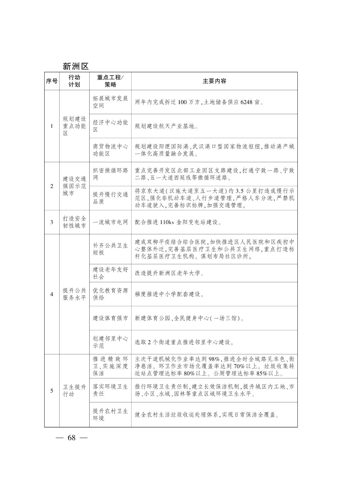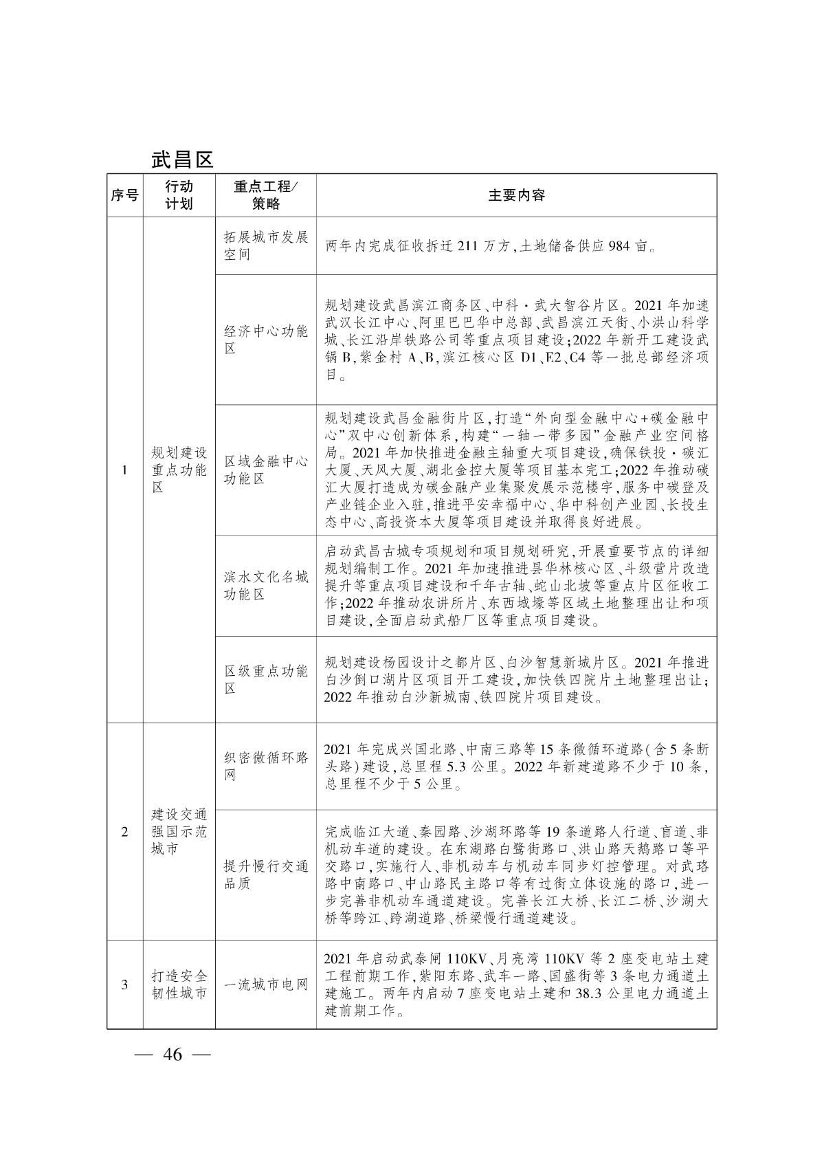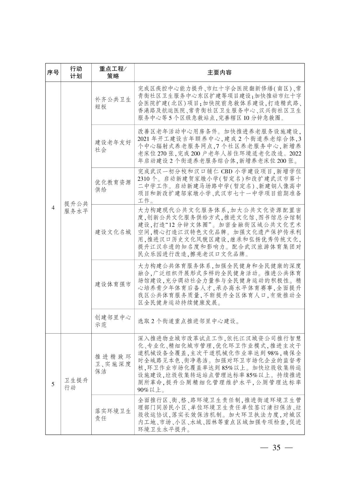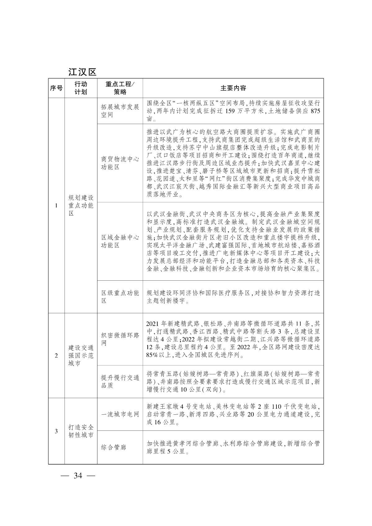 1.实施主城做优。完善城市核心功能,塑造高品质城市“主中心”形象。加强打造“两江四岸”中央活动区,坚持世界眼光,高水平开发建设二七滨江、汉正街、武昌滨江、青山滨江、王家墩、四新等重点功能区,高品质打造武昌湾、汉江湾、南湖白沙等片区,促进现代服务业集聚发展,城市功能品质有效提升。推进古城新生,打造江岸历史之径片区、江汉百年商道片区、硚口汉正老街片区、汉阳古城片区、武昌古城片区、青山红房子片区、洪山大学之城片区等7个亮点区块建设,挖掘历史文化资源,彰显文化魅力。完成城镇老旧小区改造。把老旧小区作为城市居民生活和城市治理的基本单元,以安全健康、设施完善、管理有序为目标,坚持“留改拆建控”并举,基本完成1616个2000年底之前建成的需改造城镇老旧小区改造任务。