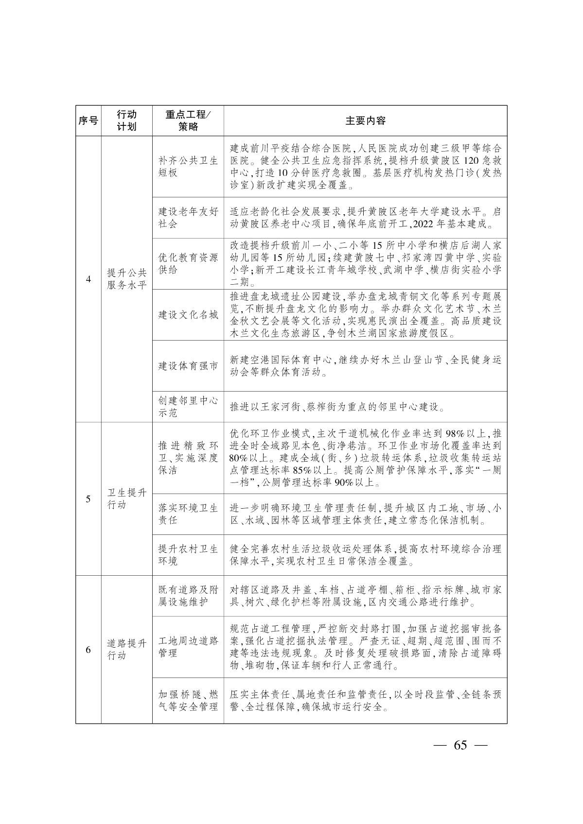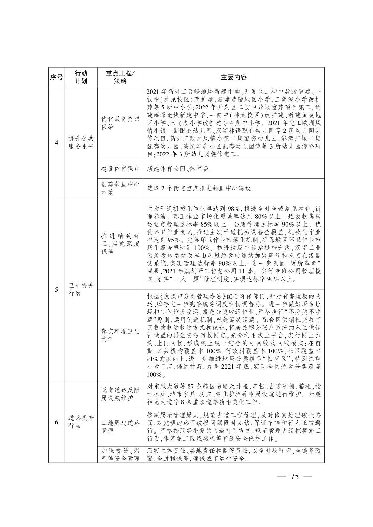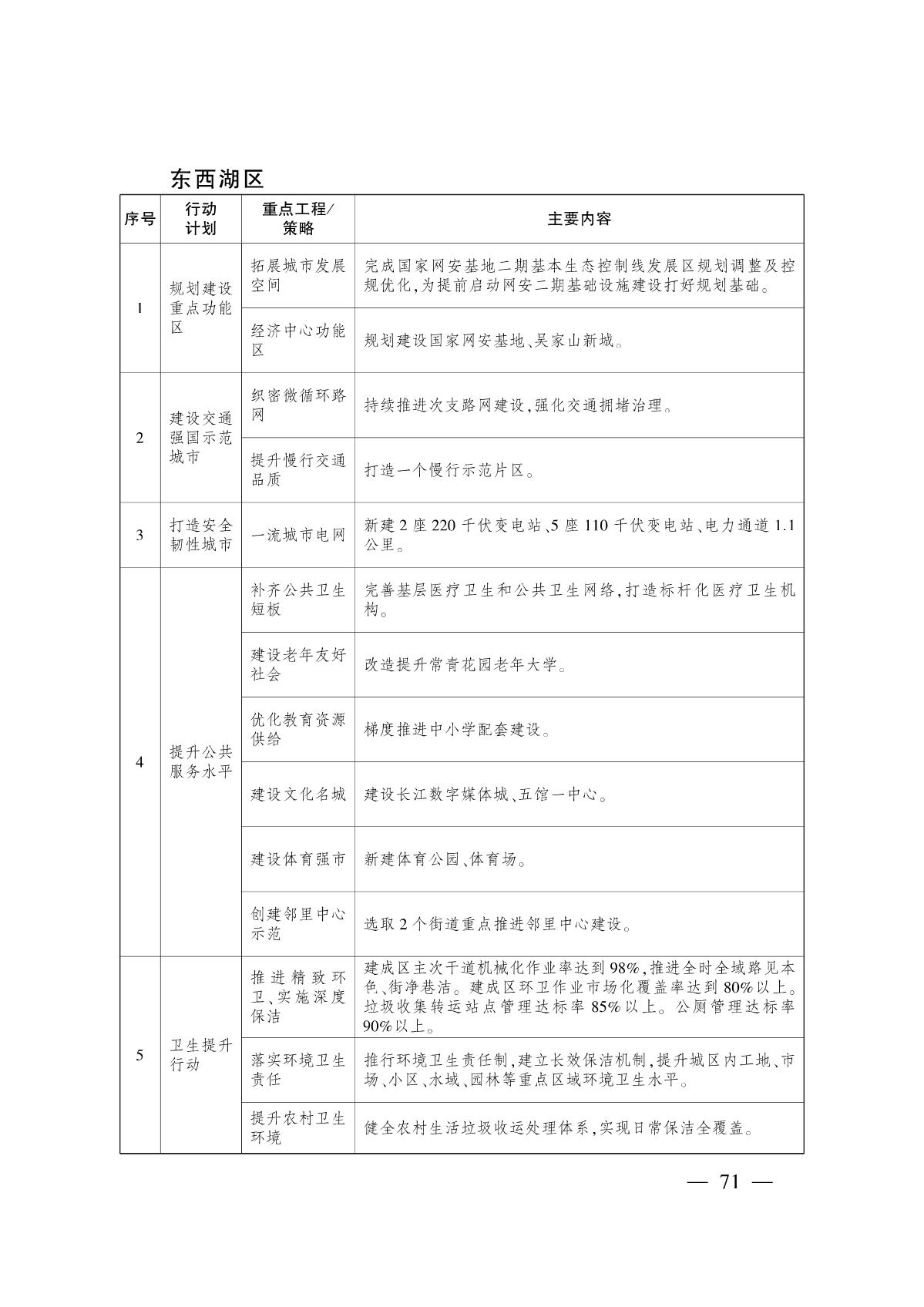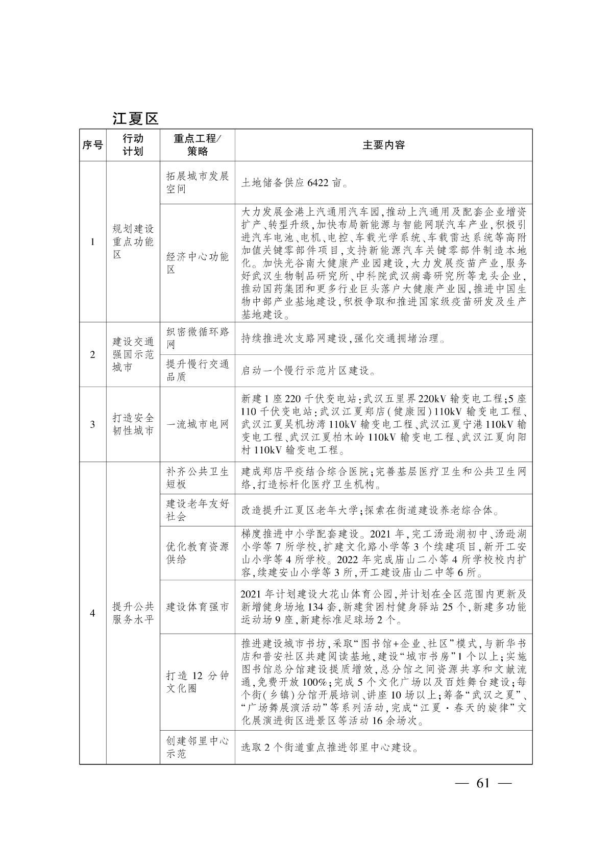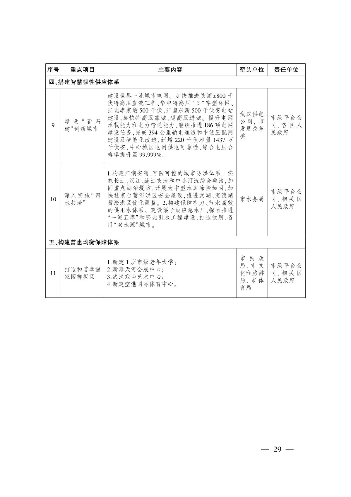 1.实施主城做优。完善城市核心功能,塑造高品质城市“主中心”形象。加强打造“两江四岸”中央活动区,坚持世界眼光,高水平开发建设二七滨江、汉正街、武昌滨江、青山滨江、王家墩、四新等重点功能区,高品质打造武昌湾、汉江湾、南湖白沙等片区,促进现代服务业集聚发展,城市功能品质有效提升。推进古城新生,打造江岸历史之径片区、江汉百年商道片区、硚口汉正老街片区、汉阳古城片区、武昌古城片区、青山红房子片区、洪山大学之城片区等7个亮点区块建设,挖掘历史文化资源,彰显文化魅力。完成城镇老旧小区改造。把老旧小区作为城市居民生活和城市治理的基本单元,以安全健康、设施完善、管理有序为目标,坚持“留改拆建控”并举,基本完成1616个2000年底之前建成的需改造城镇老旧小区改造任务。