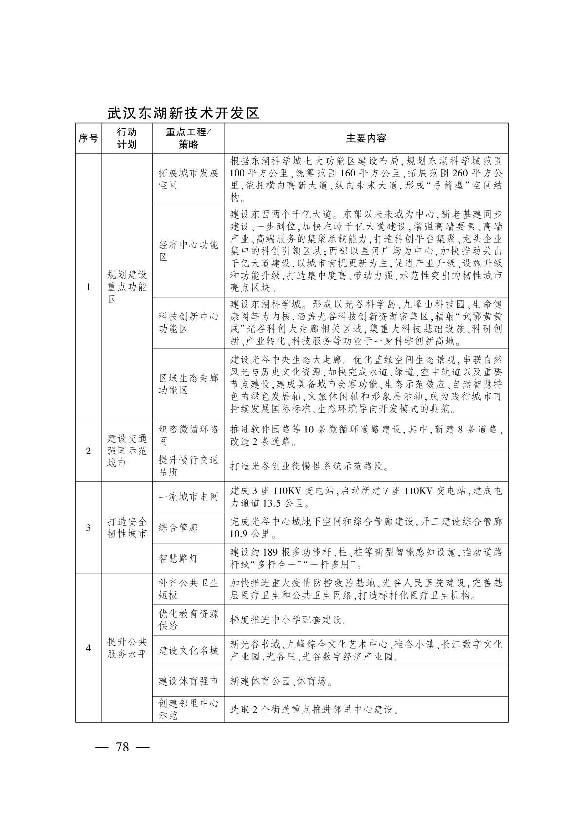 2.打造重点功能区,实施“五个中心”建设。明确主体功能区规划体系,统筹规划“五个中心”建设空间。全国经济中心方面,中心城区推进汉口滨江商务区、武昌滨江商务区、杨春湖商务区建设,谋划青山、汉阳、谌家矶、白沙滨江区等重点功能区,引领现代服务业升级;开发区和新城区以国家存储器基地、国家航天产业基地、国家新能源和智能网联汽车基地、国家网络安全人才与创新基地、大健康产业基地等为重点,支撑先进制造业发展。国家科技创新中心方面,以“大武昌+长江新区”为核心集聚区,持续推进东湖科学城、光谷科学岛、洪山大学之城等重点功能区建设,培育发展长江新区科教城,承载综合性科学中心、科教创新中心功能。国家商贸物流中心方面,以大汉口地区为核心集聚区,重点推进汉正街中央服务区、汉口北商贸区等重点功能区建设,承载商贸、消费中心职能;提升武汉航空城、阳逻国际港等重点功能区,承载综合交通枢纽职能。国际交往中心方面,以大汉阳地区为核心集聚区,重点推进龟北、中法生态城等重点功能区建设,承载国际赛事、国际合作等职能。区域金融中心方面,重点以武汉金融城、光谷中心城、武昌金融街、汉阳基金基地等重点功能区为载体,培育总部金融集聚区。
