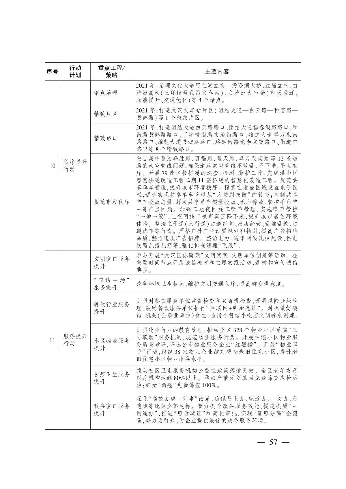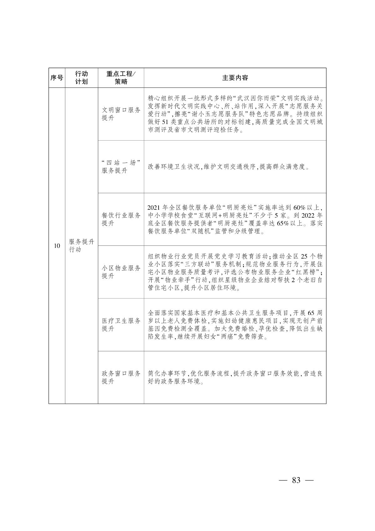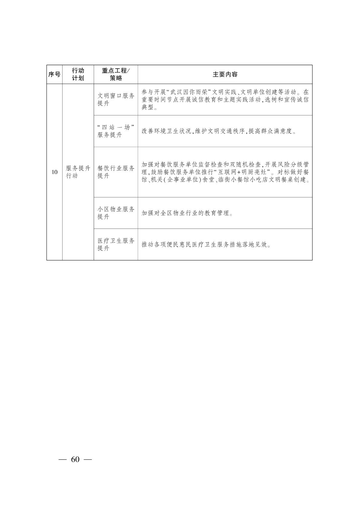 (七)聚焦“优”,实施服务提升行动。以“武汉因你而荣”文明实践、文明单位创建等活动为抓手,提高行业文明创建水平和窗口服务质量。实施全市重点窗口行业群众满意度季度测评(40个重点窗口行业),落实工作讲评和媒体公示机制。开展“四站一场”文明程度月度测评,实行一月一检查、一月一排名、一月一通报。加强对餐饮服务单位监督检查和双随机检查,开展风险分级管理,鼓励推行“互联网+明厨亮灶”,深化文明餐桌创建。加强全市物业服务行业教育管理,定期开展督查排名通报。提升医疗卫生机构办实事水平,改善服务态度、提升服务质量、优化就医体验。推进“一站式”政务服务,精简优化办理流程,完善限时办结、容缺办理、并联审批和重大事项全程代办服务机制,提升窗口服务质效。