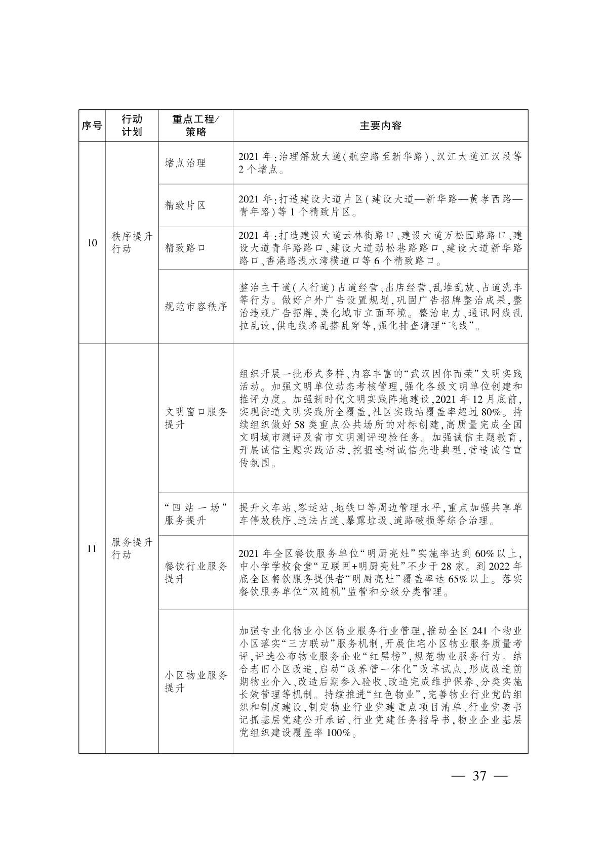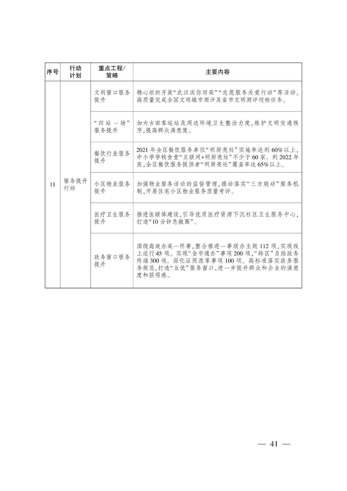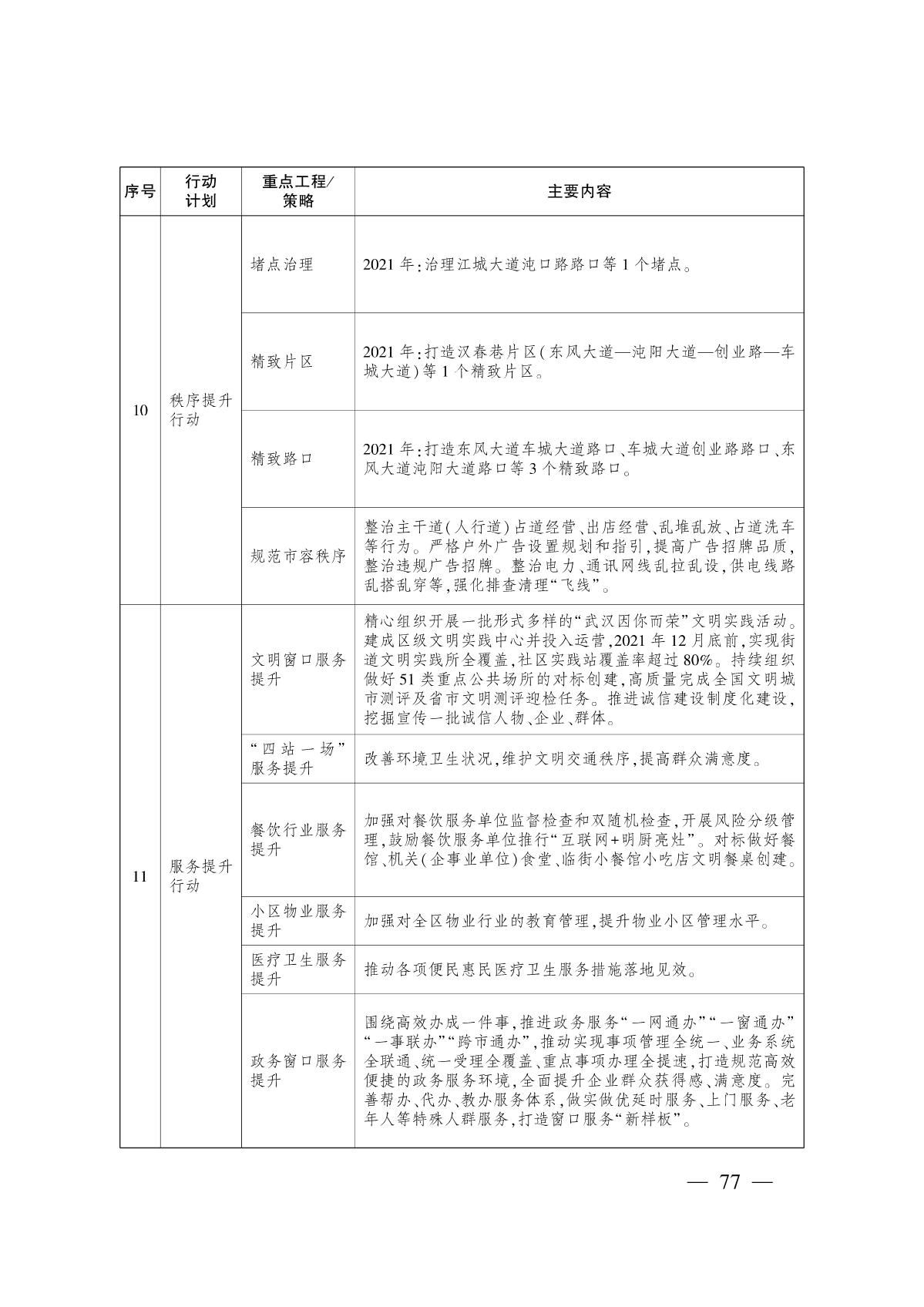 (七)聚焦“优”,实施服务提升行动。以“武汉因你而荣”文明实践、文明单位创建等活动为抓手,提高行业文明创建水平和窗口服务质量。实施全市重点窗口行业群众满意度季度测评(40个重点窗口行业),落实工作讲评和媒体公示机制。开展“四站一场”文明程度月度测评,实行一月一检查、一月一排名、一月一通报。加强对餐饮服务单位监督检查和双随机检查,开展风险分级管理,鼓励推行“互联网+明厨亮灶”,深化文明餐桌创建。加强全市物业服务行业教育管理,定期开展督查排名通报。提升医疗卫生机构办实事水平,改善服务态度、提升服务质量、优化就医体验。推进“一站式”政务服务,精简优化办理流程,完善限时办结、容缺办理、并联审批和重大事项全程代办服务机制,提升窗口服务质效。