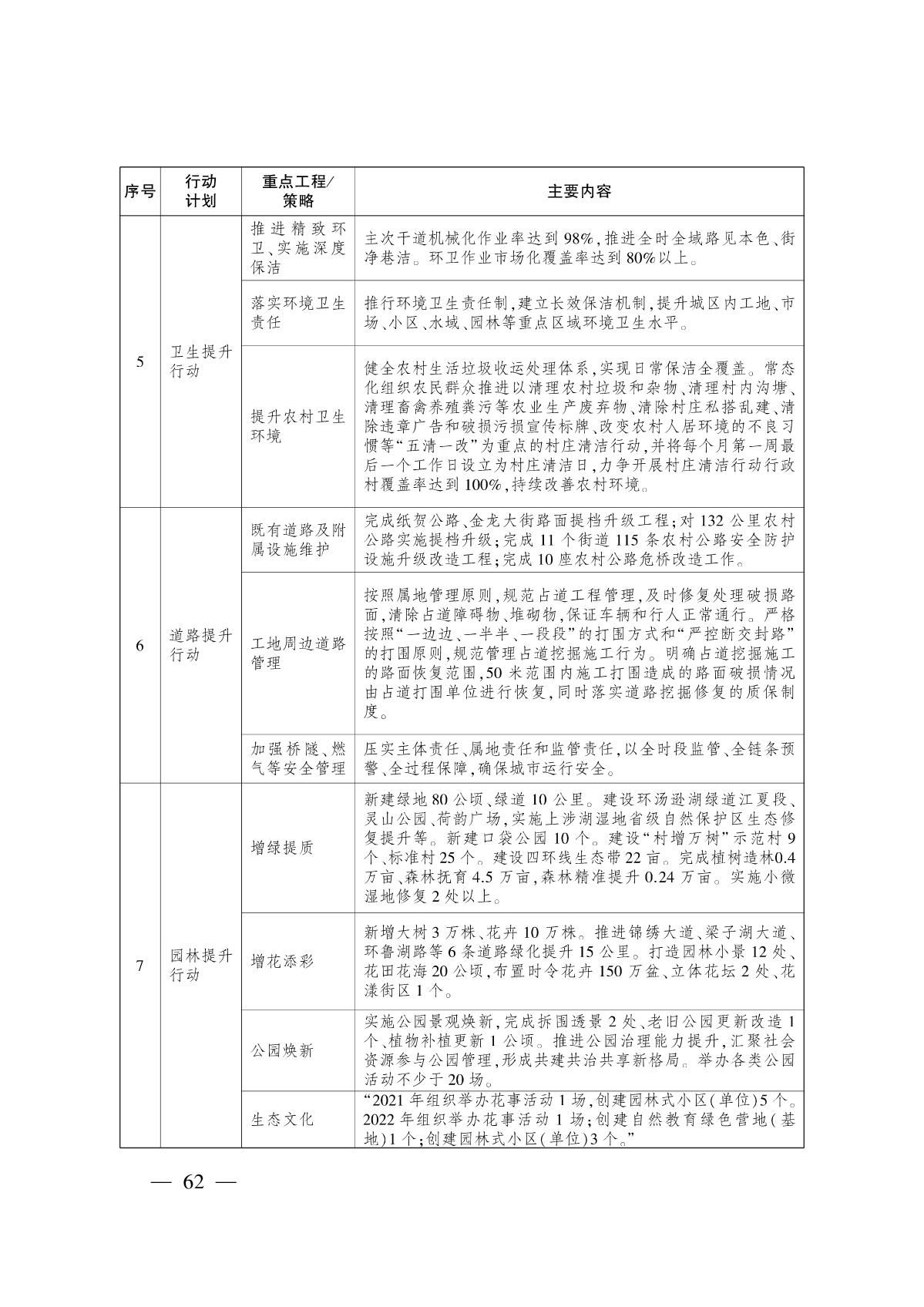 (一)聚焦“净”,实施卫生提升行动。构建与超大城市生活垃圾分类相适应的垃圾治理体系。全面落实“精致环卫”严规30条,实施深度保洁,主次干道机械化作业率达到98%以上,环卫作业市场化覆盖率达到80%以上,保障全时全域路见本色、街净巷洁。加大工地、市场、村湾、公路、水域、老旧小区、城中村、城乡结合部、铁路沿线、进出城道路等环境整治,实现薄弱区域环境面貌明显改善。加强环卫设施运行管理,200余座垃圾收集转运站点、14座生活垃圾处理场所达标率达到95%以上,2000余座公厕达标率达到90%以上,全面取缔建成区旱厕。完善生活垃圾处置体系,推进建筑垃圾资源化利用,到2025年,全市生活垃圾无害化处理能力达到2万吨/日以上。落实320个农贸市场环境卫生管理主体责任。强化405条重要道路、背街小巷两侧绿化带、花坛卫生管理,加强300个主要城市公园、广场、街头游园、口袋公园等场所日常保洁,健全环境卫生长效管理机制,问题整改合格率达到95%以上。实现1.3万个村湾日常保洁全覆盖,全市行政村生活污水治理覆盖率达到80%以上、处理率达到70%以上,建设200个以上美丽乡村示范村。
