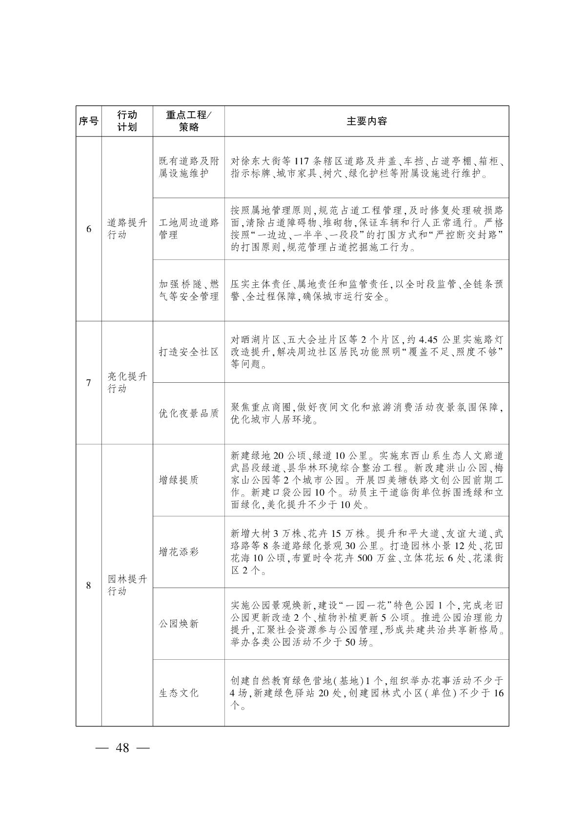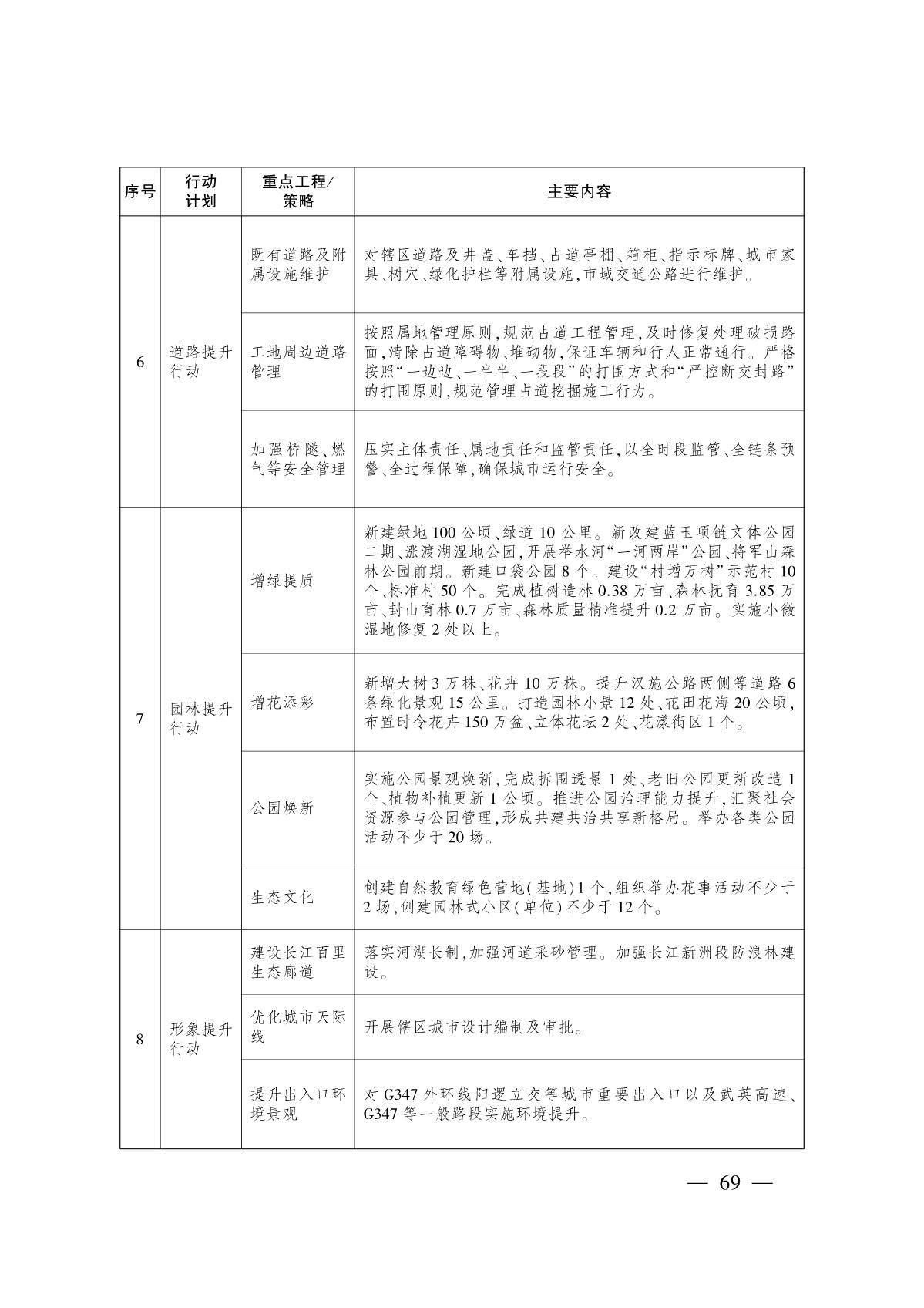 (四)聚焦“绿”,实施园林提升行动。打造“一路一景”,对武汉大道、长江大道、解放大道等100条重要道路进行绿化景观提升。突出“一园一花”,完善堤角公园、和平公园、沙湖公园等10个花卉特色公园。开展“花靓江城”行动,布置园林花卉小景300处,打造花田花海300公顷,创建花漾街区30个,布置立体花坛、创意绿雕60处。实施“公园焕新”行动,推进城市公园拆围透景100处,改造提升老旧公园30个,植物补植更新100公顷,开展公园文化活动2000场,提升公园治理水平,形成公园管理共建共治共享新格局。推进精细化管理,落实建设、养护监管一体化,规范标准化作业程序,严格落实“三级”养护管理检查考核制度,开展公园、道路绿化“双十佳”评比,打造精致园林。通过完善生态资源“一张图”系统,实施湿地监测、园林智能喷灌、智慧公园等智慧化建设,提升绿化管理效能。全面推行“林长制”,强化森林资源保护管理,提升森林防灭火能力,严防林业有害生物。