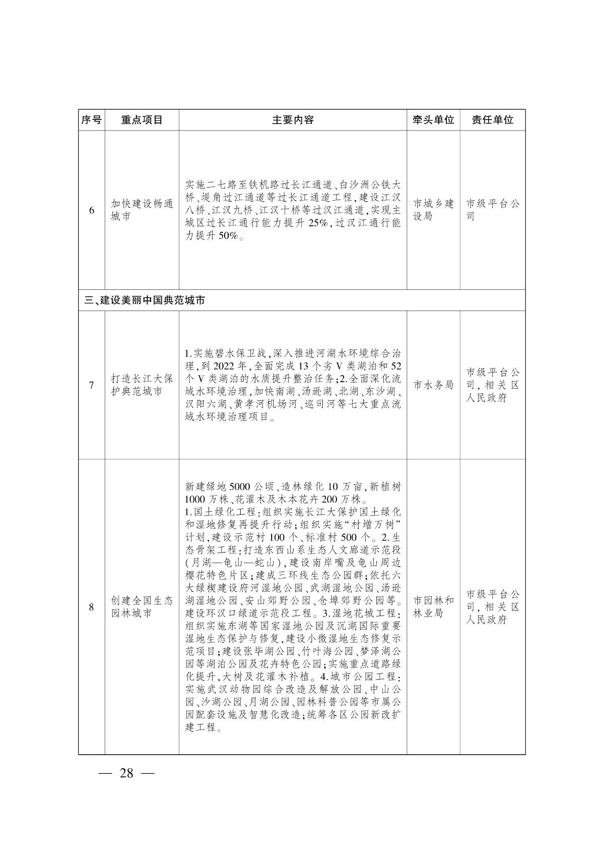 1.打造长江大保护典范城市。打好碧水保卫战,深入推进河湖水环境综合治理,到2022年,全面完成13个劣V类湖泊和52个V类湖泊水质提升整治任务,全面深化流域水环境治理,加快南湖、汤逊湖、北湖、东沙湖、汉阳六湖、黄孝河机场河、巡司河等七大重点流域水环境治理,不断推动流域水环境质量整体提升,构建水清岸绿、截污控源的水环境治理体系。