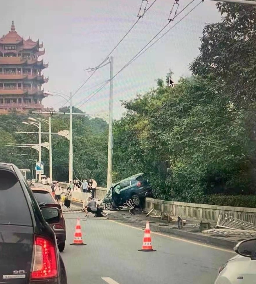 长江日报7月19日讯 7月19日17时30分许,一辆蓝色轿车冲上长江大桥栏杆,事故现场可以看到,该车车头撞上路灯杆,车头损毁严重,道路的分隔护栏被撞倒,目前交警已经赶到现场处置。
