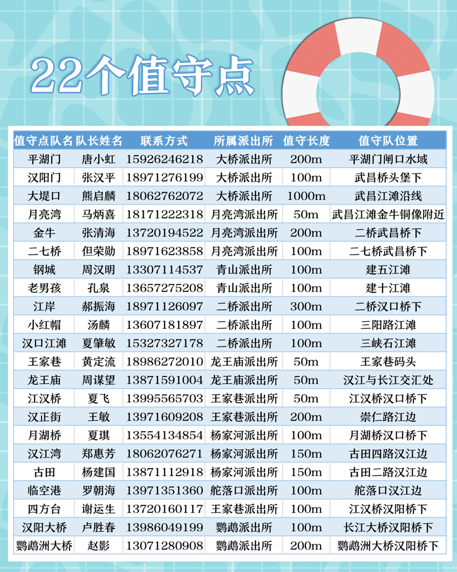 长江日报7月19日讯 夏季是溺水事故高发期,守护人民群众安全,从6月1日到10月初,600多名长江救援志愿队队员在武汉两江四岸22个值守点进行值守。7月19日,记者联系长江救援志愿队,制作出了一份武汉“防溺水地图”,图中梳理了武汉22个值守点的具体位置、负责人联系方式,方便群众紧急求助。