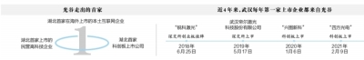 近4年来,武汉每年第一家上市企业都来自光谷:2018年6月25日,“锐科激光”在深交所创业板挂牌;2019年5月17日,武汉帝尔激光科技股份有限公司在深交所上市;2020年1月6日,“兴图新科”在科创板上市;2021年2月9日,“四方光电”在科创板上市。