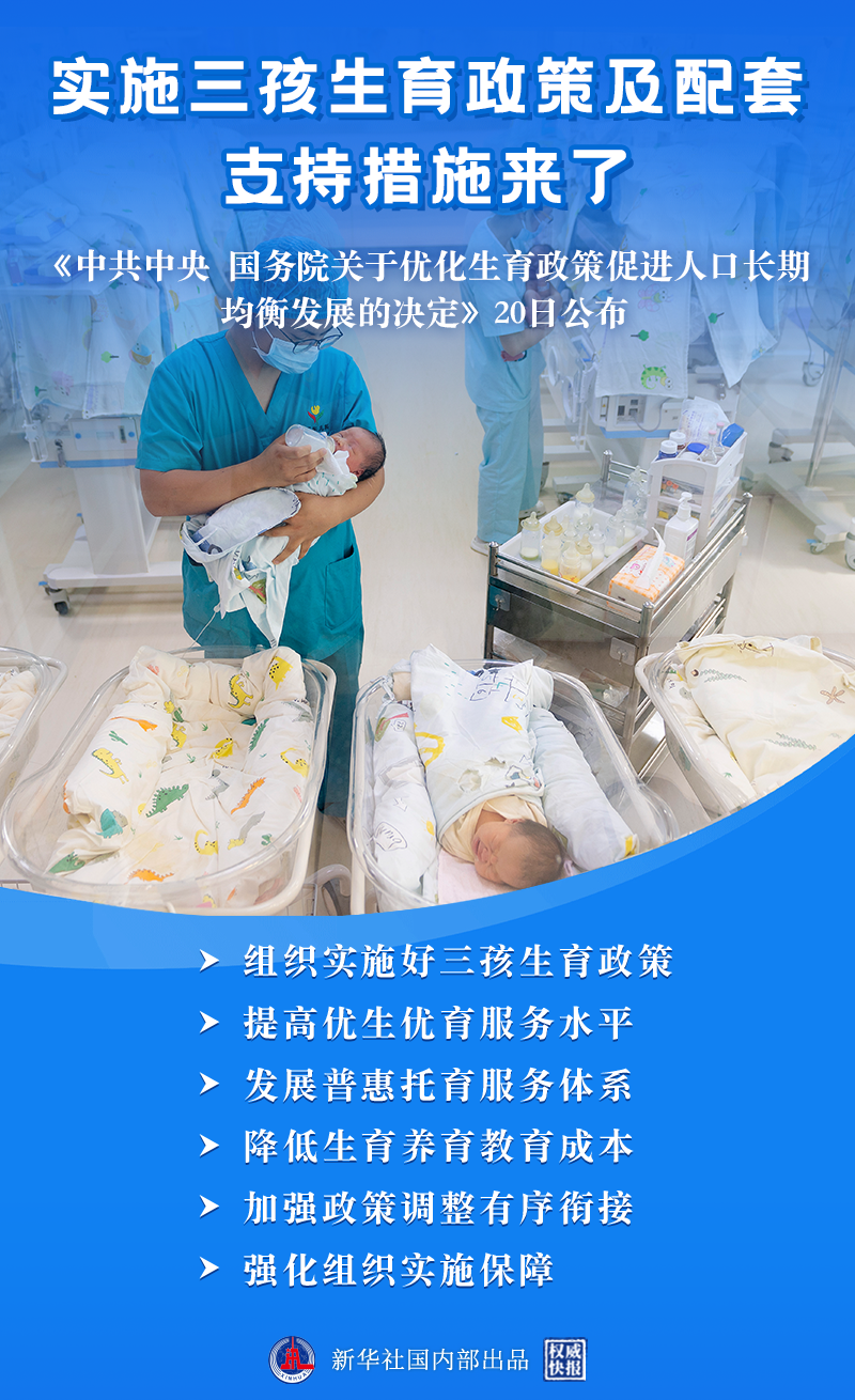 《中共中央国务院关于优化生育政策促进人口长期均衡发展的决定》7月20日公布,这一中央决定顺应群众期盼,提出实施三孩生育政策及配套支持措施……详见>>