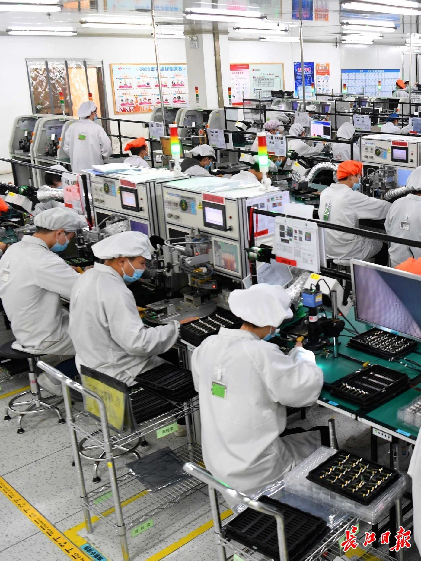 华工科技核心子公司华工正源5G模块生产车间,工作人员正在生产线上忙碌。长江日报记者高勇 摄