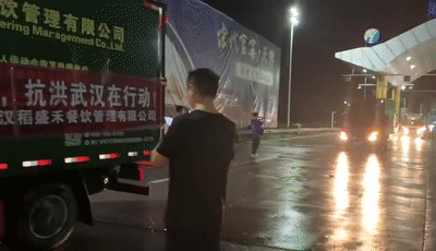 抗疫全民援武汉,抗洪武汉在行动。这是披在车身上的标语。王成辉动情地说,这些慰问物资,就权当代表武汉人民对河南人民的一点心意。