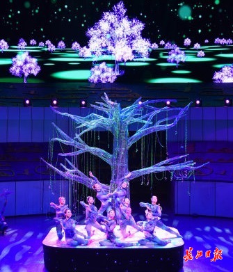 在高难、惊险的技巧中看见中国精神,也在梦幻、柔美的表演中藏着坚韧力量。浪漫的小提琴声中,大屏幕上浮现出绚烂的云霞,在仿如幻境的氛围中,浪漫的绸吊上演了。这如梦似幻的一幕,让人们联想起“夕阳爷爷”的温情瞬间。而传统技艺“女子柔术”,被创造性地呈现为一棵“生命之树”,氛围演员则化作鸟语花香,整个舞台成为生机勃勃的春景。