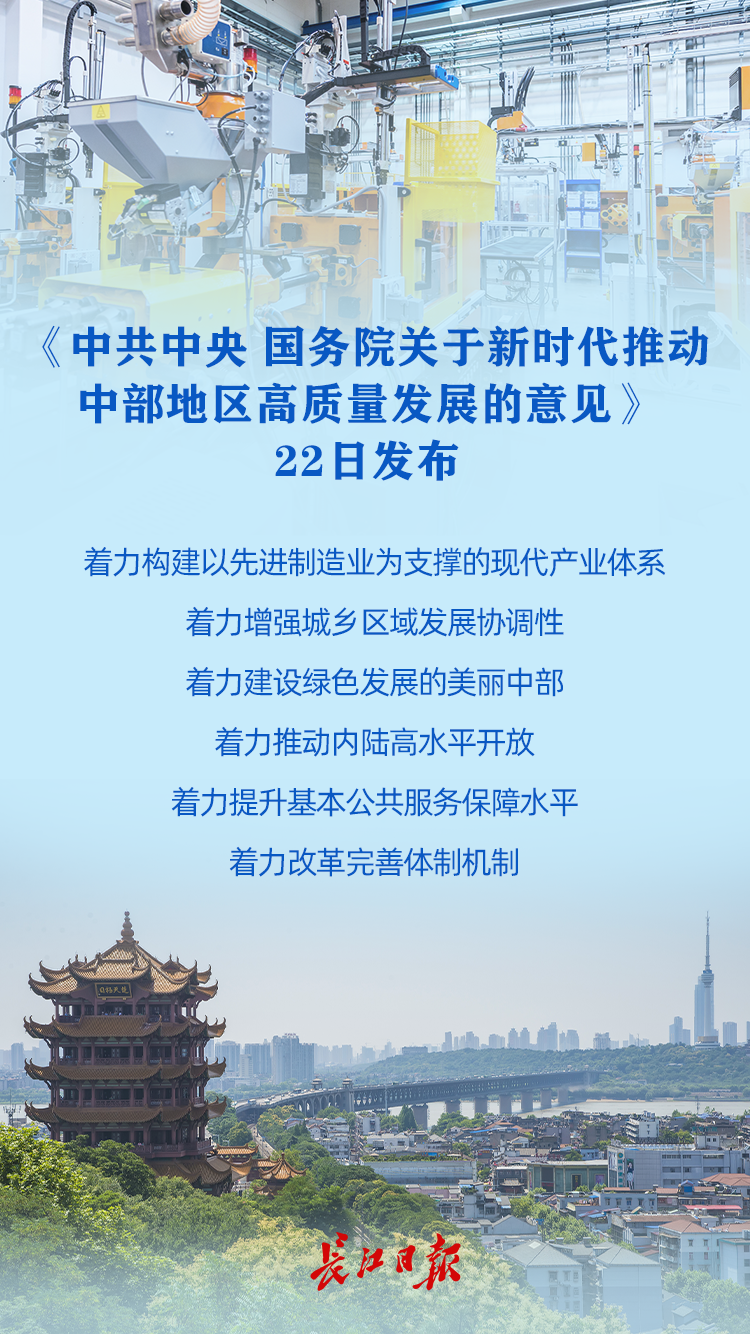 《中共中央 国务院关于新时代推动中部地区高质量发展的意见》22日发布,提出着力构建以先进制造业为支撑的现代产业体系,着力增强城乡区域发展协调性,着力建设绿色发展的美丽中部,着力推动内陆高水平开放,着力提升基本公共服务保障水平,着力改革完善体制机制,推动中部地区加快崛起,在全面建设社会主义现代化国家新征程中作出更大贡献。