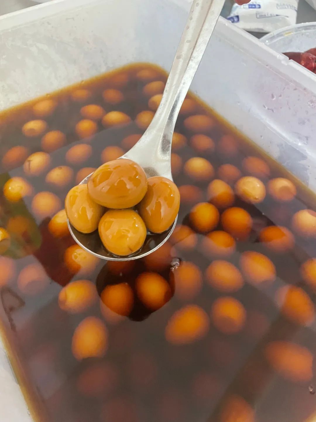 袁培从冰柜中取出一盒刚刚泡好的鹌鹑蛋,邀请记者品尝。