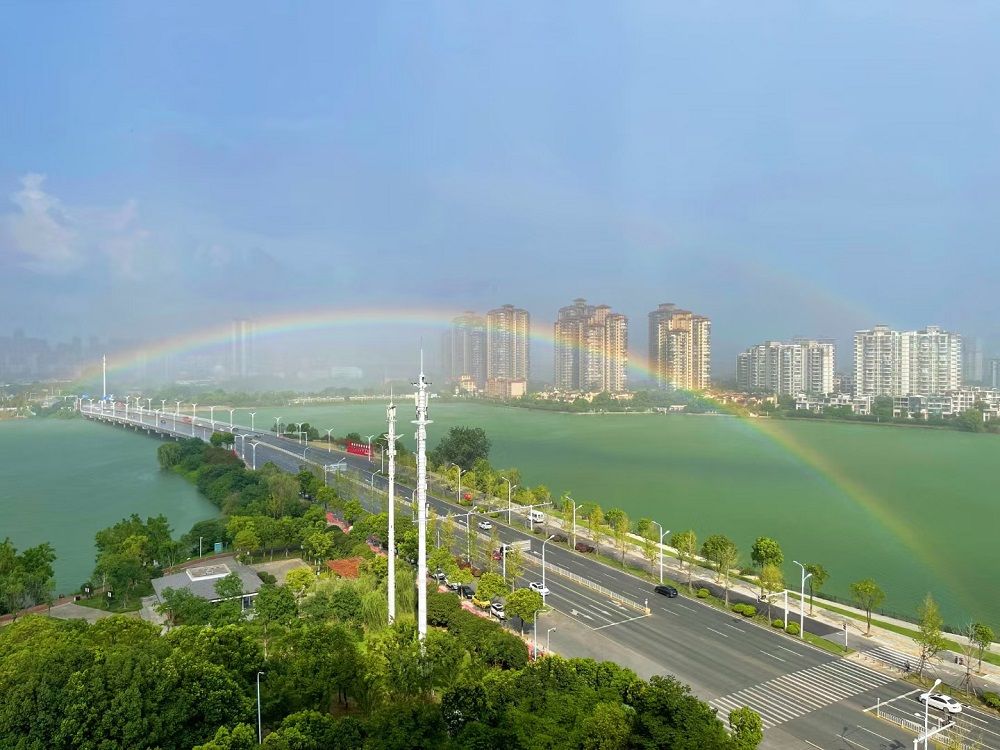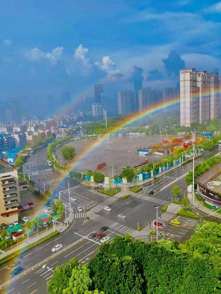 21日下午4时左右,武汉CBD商务区、金银湖区域出现了短时阵雨,很快雨过天晴,天空中出现了双彩虹,产生炫目的光晕。摄影师将图片分享到城市摄影队的微信群里,立即引来惊叹声:“好漂亮的彩虹!”摄影师曾蕾说:“能看到双彩虹超激动,希望大家都能拨开云雾,见到美丽的彩虹。”