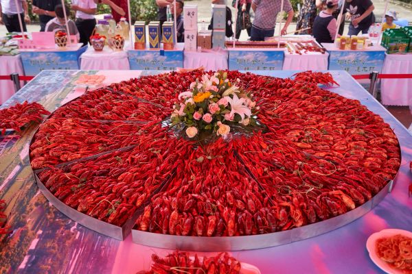 江夏·金水首届莲藕龙虾节好吃又好玩活动现场的虾味大餐。(资料图片)