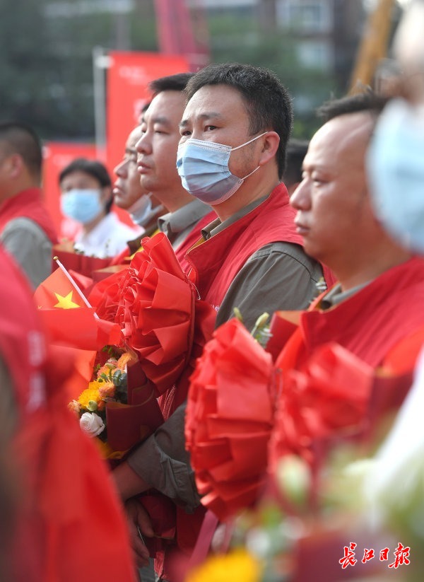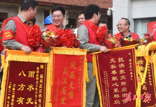 工作人员为国网武汉供电公司支援郑州救灾队的队员们献上鲜花。长江日报记者 周超 摄
