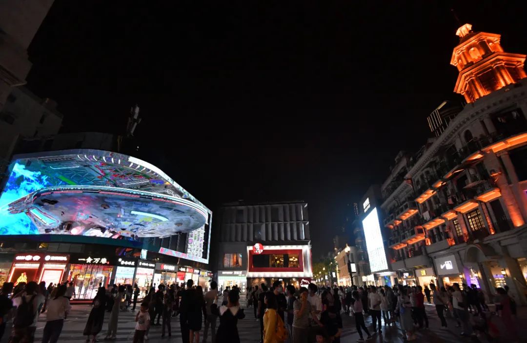 ▲ Visitors on Jianghan Road pedestrian street enjoy naked-eye 3D screen. Photo by Yu Zhiyong