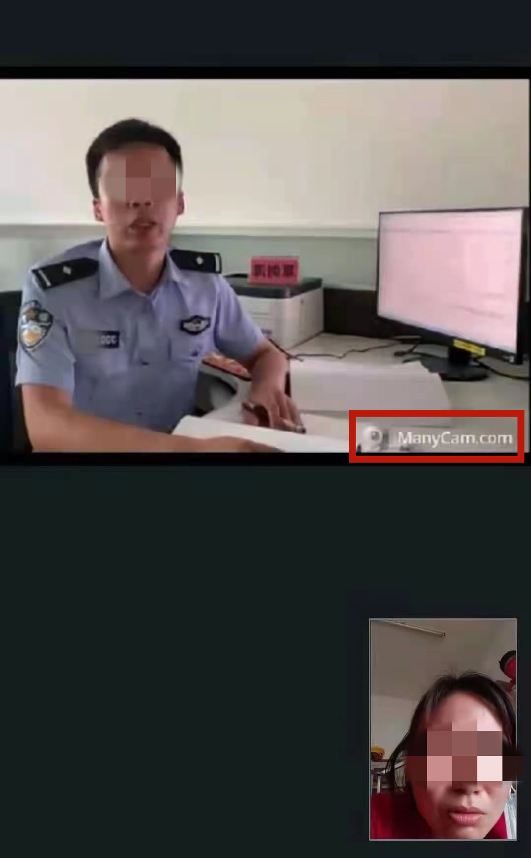 桂韵(化名)与假警察视频通话截图,ManyCam为虚拟摄像头软件,可以更改视频通话内容。通讯员冯威供图