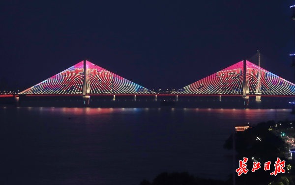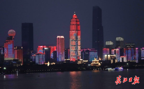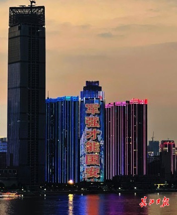 长江日报记者在汉口江滩看到,随着夜幕降临,以两江四岸的建筑、桥体、山体以及趸船码头为恢弘幕布,绚烂光影铺陈水天一色,以动感的画面勾勒出江城大美夜色。