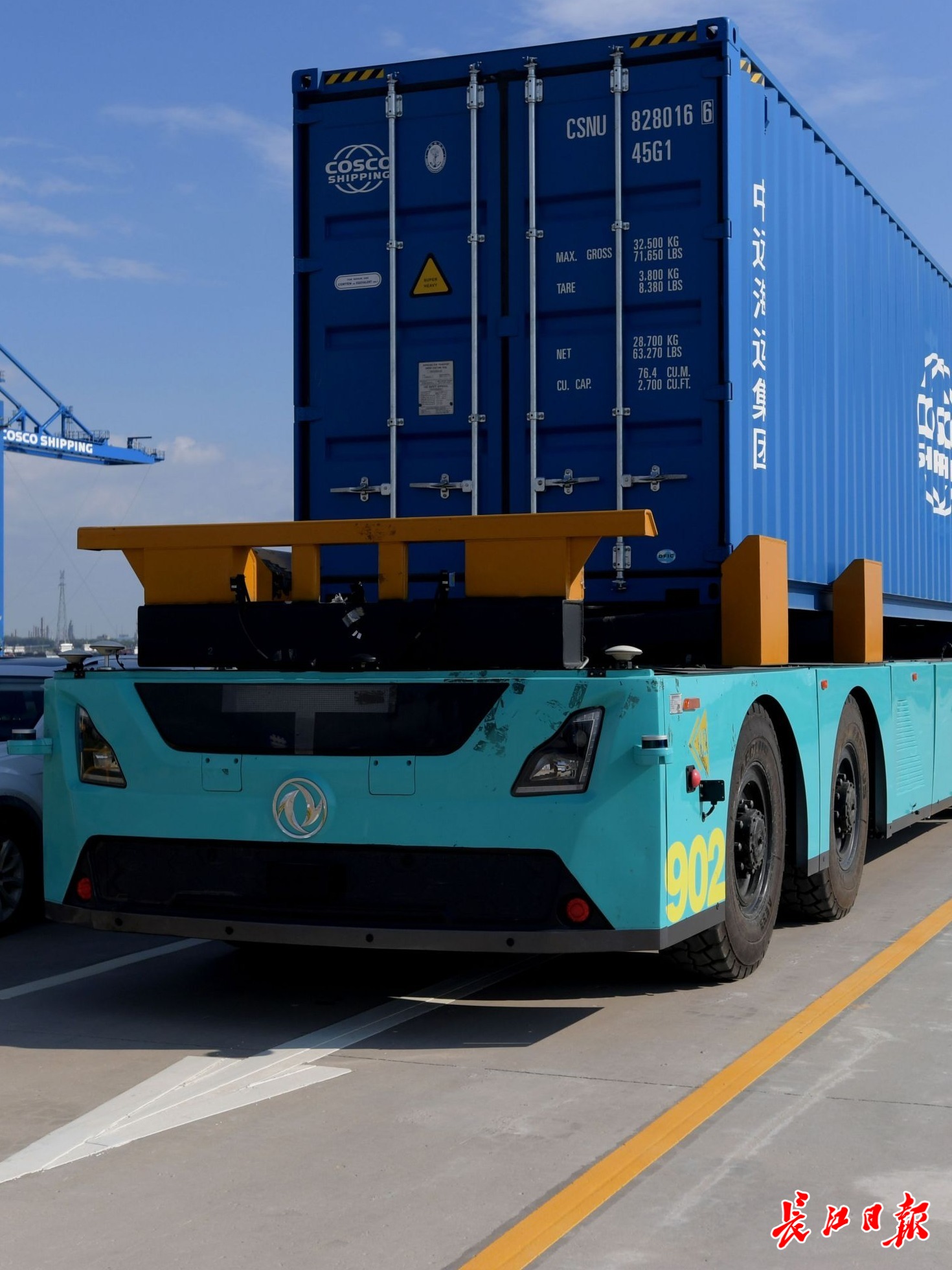 阳逻国际港集装箱水铁联运二期项目开港通车后,将成为我国首个铁路装卸自动化码头。工作人员在武汉中远海运港口码头总控室发出指令,无人驾驶卡车自动行驶装卸集装箱。图为无人驾驶集装箱卡车在码头内道路上试运行。长江日报记者刘斌 摄
