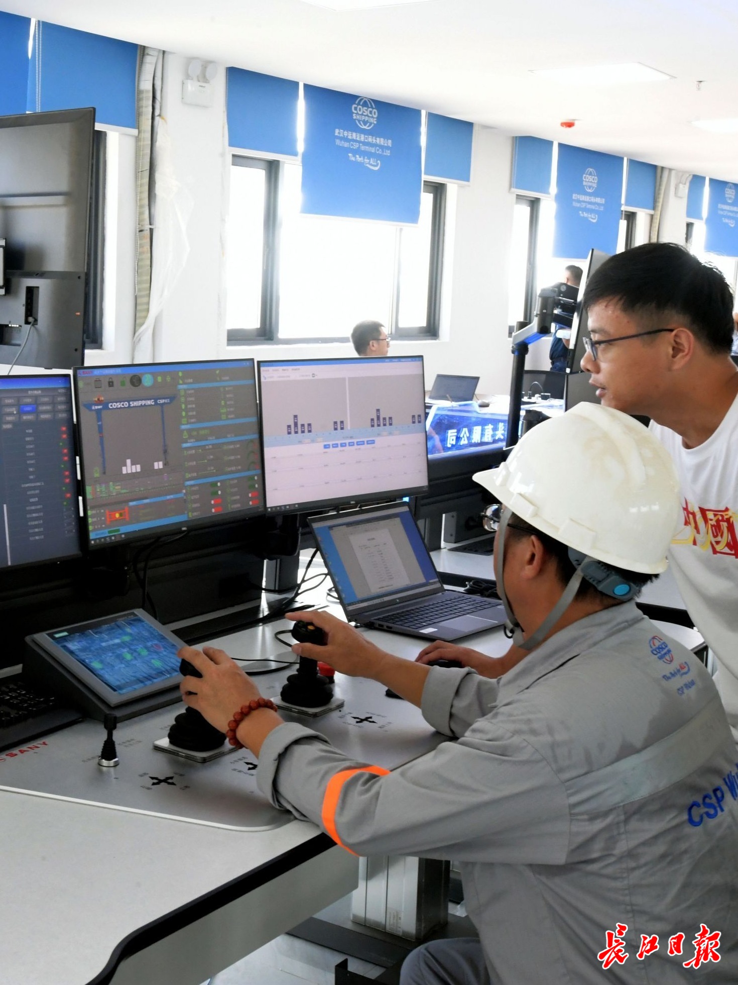 武汉中远海港口码头有限公司总控室,工作人员正在检测智能系统。长江日报记者刘斌 摄