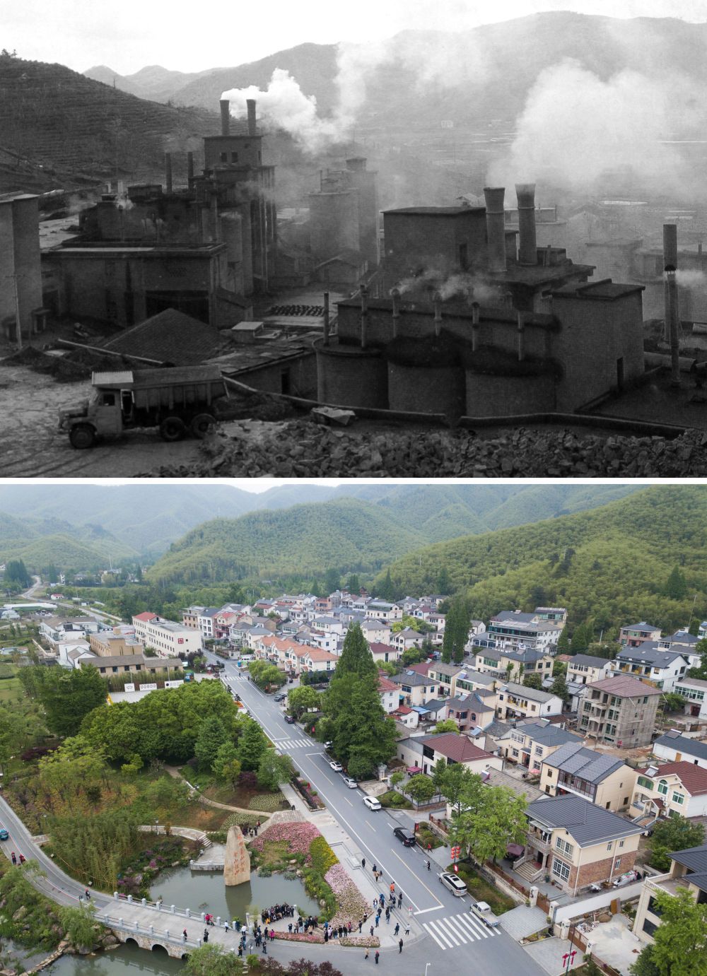 拼版照片:上图为浙江省湖州市安吉县天荒坪镇余村二十世纪八十年代的资料照片;下图为2018年4月24日,游客在整修一新的余村游览(新华社记者翁忻旸摄)。新华社发