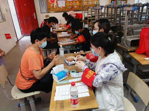 采样现场设在两间教室内,分别为登记区、采样区。教室开着空调,开着门和窗户,在确保安全的情况下,为医务工作者尽可能提供凉爽的采样环境。