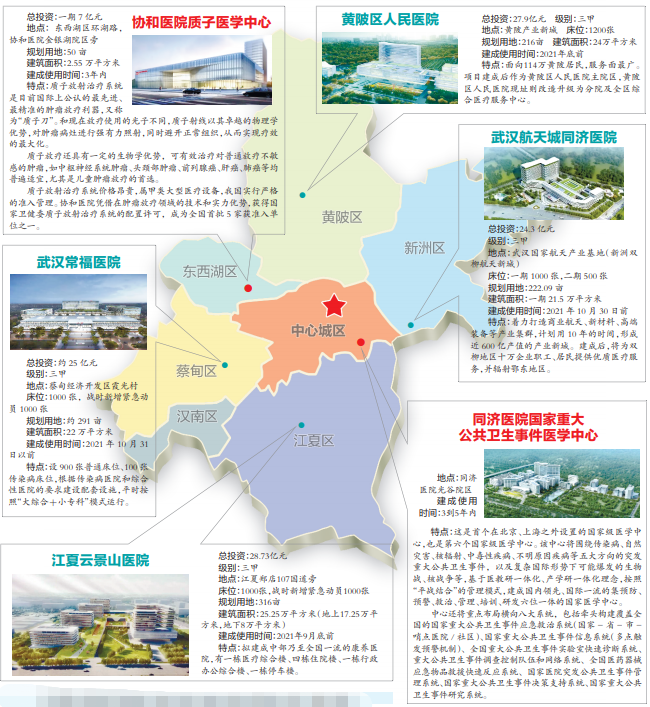 “四区”项目指四个新城区各新建1家平战结合、常备床位1000张的三甲医院,分别是江夏区云景山医院、黄陂区人民医院、蔡甸区武汉市常福医院、新洲区武汉同济航天城医院;“两院”项目指新建华中科技大学附属同济医院国家重大公共卫生事件医学中心和华中科技大学附属协和医院质子医学中心。