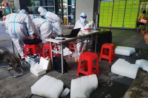 8月4日上午,东湖高新区当代社区,工作人员一边从小车上卸下冰块,一边回答医护人员的问题:“这是社区为了大家降温,特意买的。”