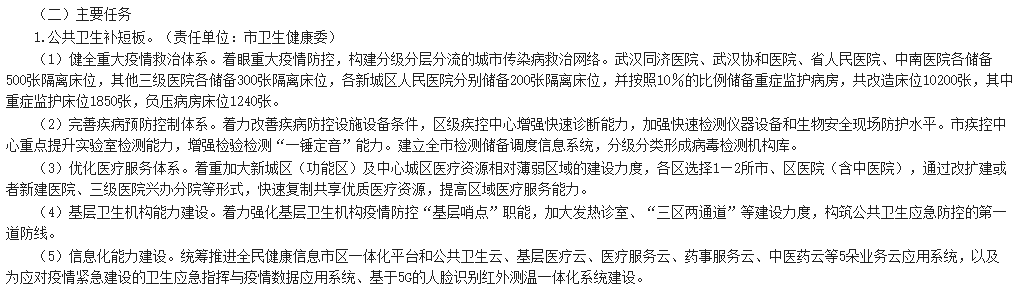 《武汉市落实全省疫后重振补短板强功能“十大工程”三年行动方案(2020—2022年)任务清单》显示,武汉同济医院、武汉协和医院、省人民医院、中南医院各储备500张隔离床位,其他三级医院各储备300张隔离床位,各新城区人民医院分别储备200张隔离床位,并按照10%的比例储备重症监护病房,共改造床位10200张,其中重症监护床位1850张,负压病房床位1240张。