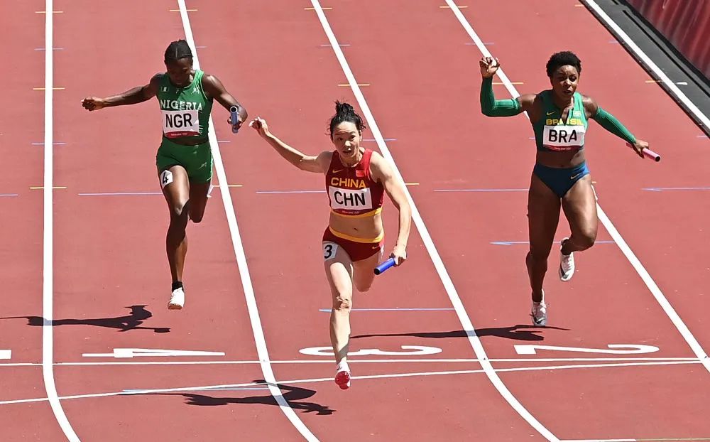 8月5日,中国队第四棒韦永丽(中)在比赛中。新华社记者李一博 摄