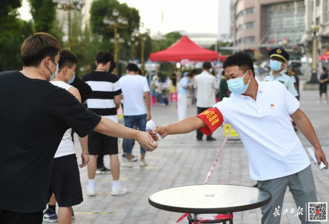 测刚下班从单位赶来的下沉党员科投集团员工刘迅(右一)为排队市民测体温。记者高勇 通讯员徐国民 摄