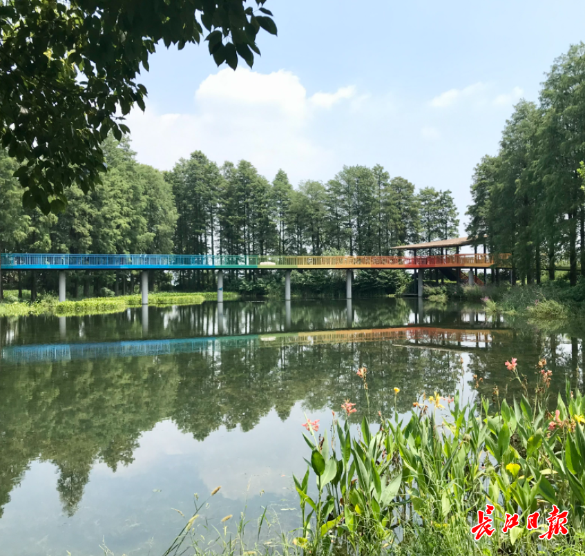 长江日报讯 干净整洁的绿道旁,青草葱茏,低矮的灌木和高大的乔木错落有致,林间鸟语蝉鸣。明镜一般的水中倒映着树木的影子,走近细看,池水清澈见底,小鱼儿成群地在“水下森林”中游弋。